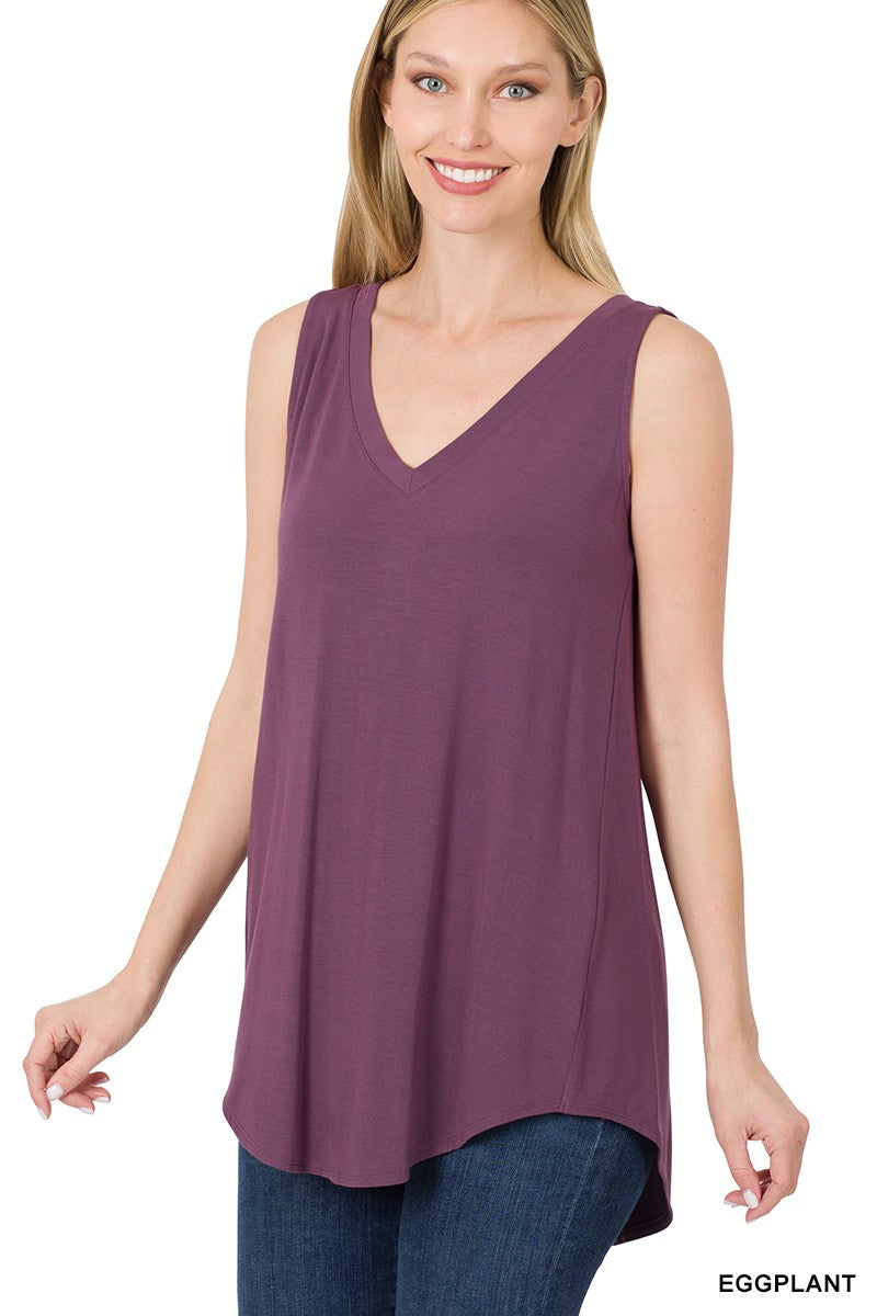 Sleeveless top with Vneck feature and high low hem. 95% Modal, 5% Spandex