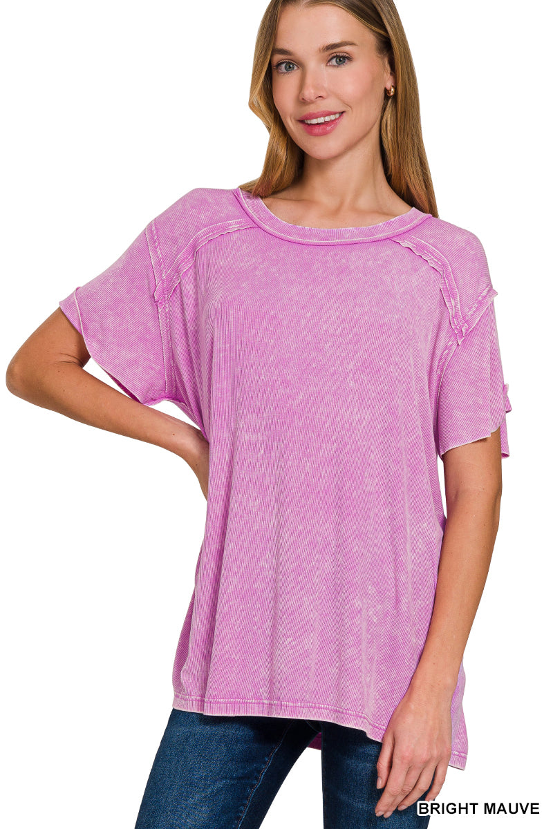 Bright Mauve Washed Ribbed Short Sleeve Top