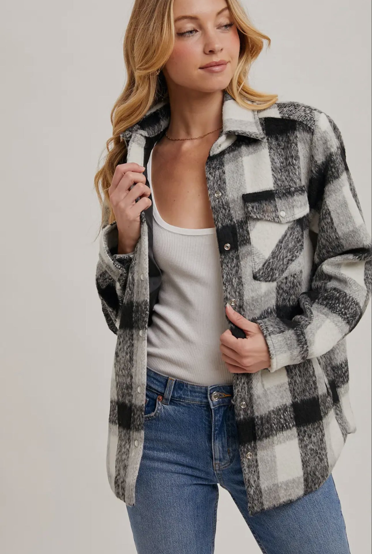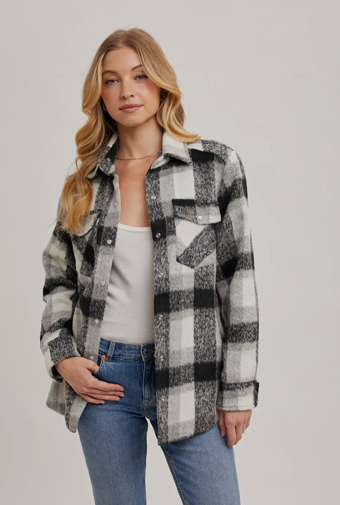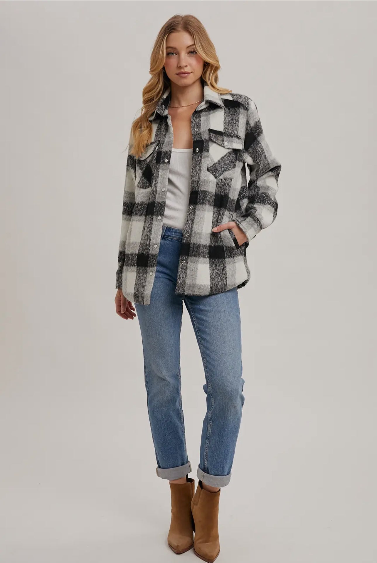 The versatility and classic appeal of this plaid shacket make it a must-have piece for any wardrobe.