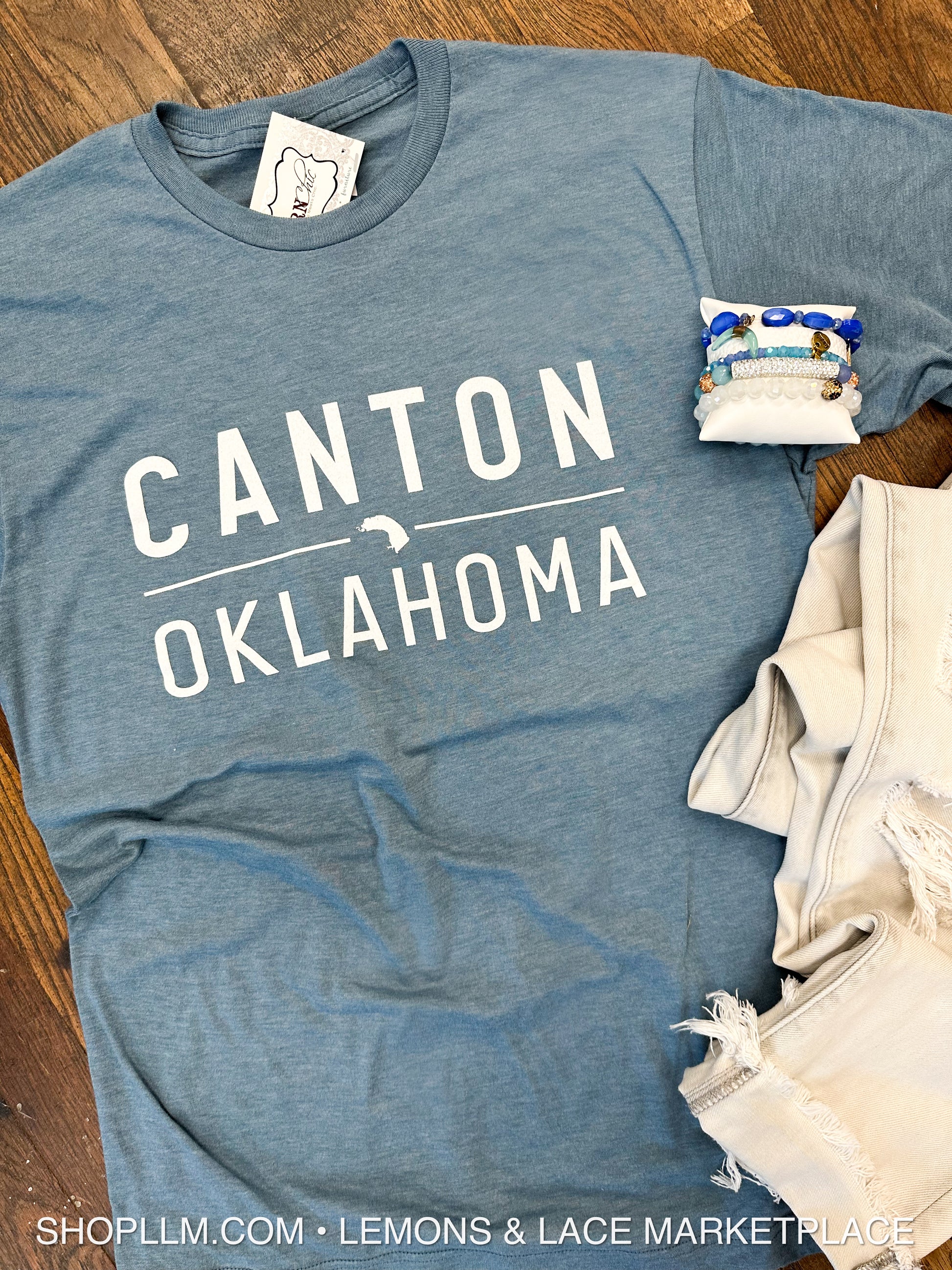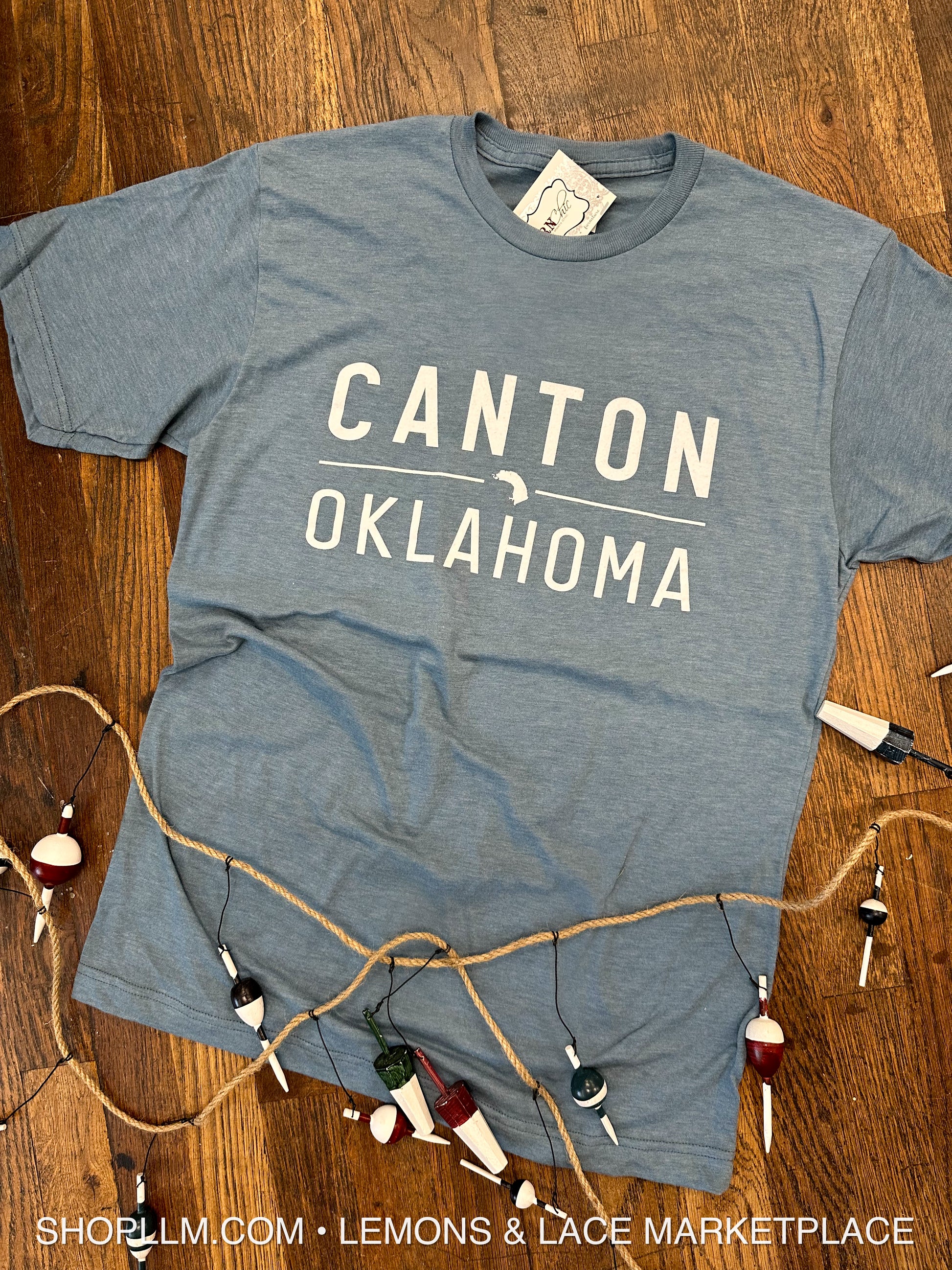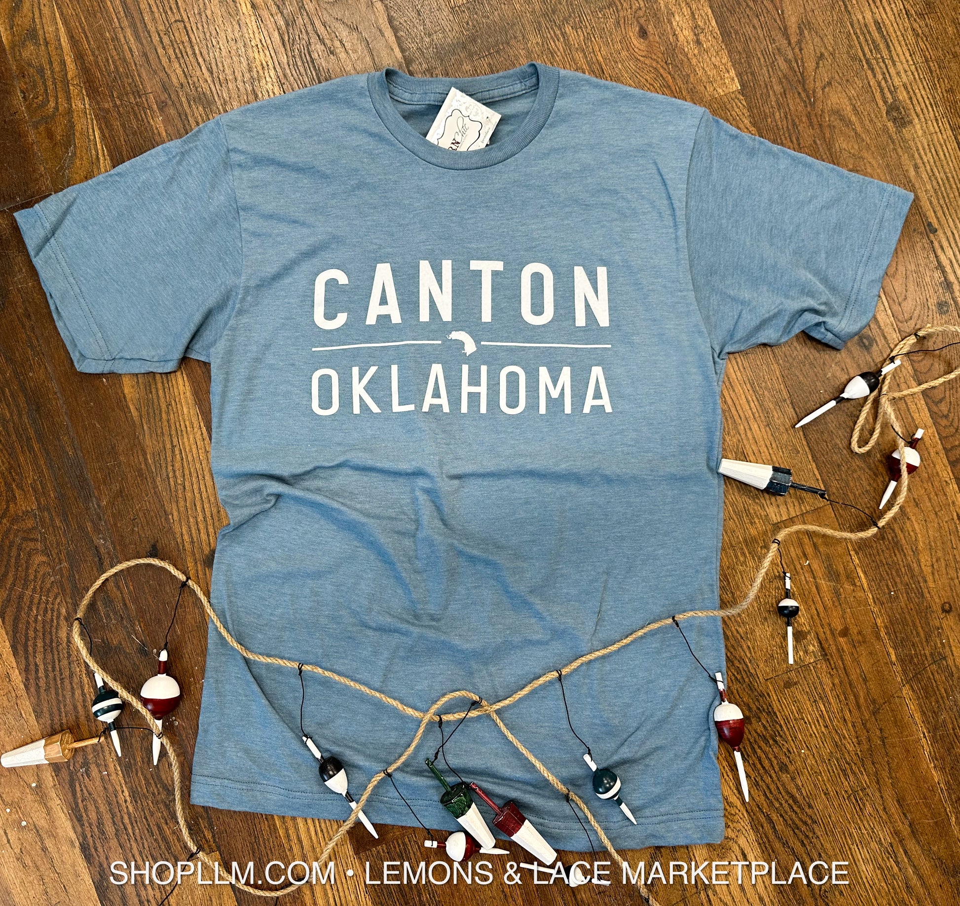 Unisex style tee with screen printed Canton Oklahoma in White. Small Canton Lake symbol in between the wording.