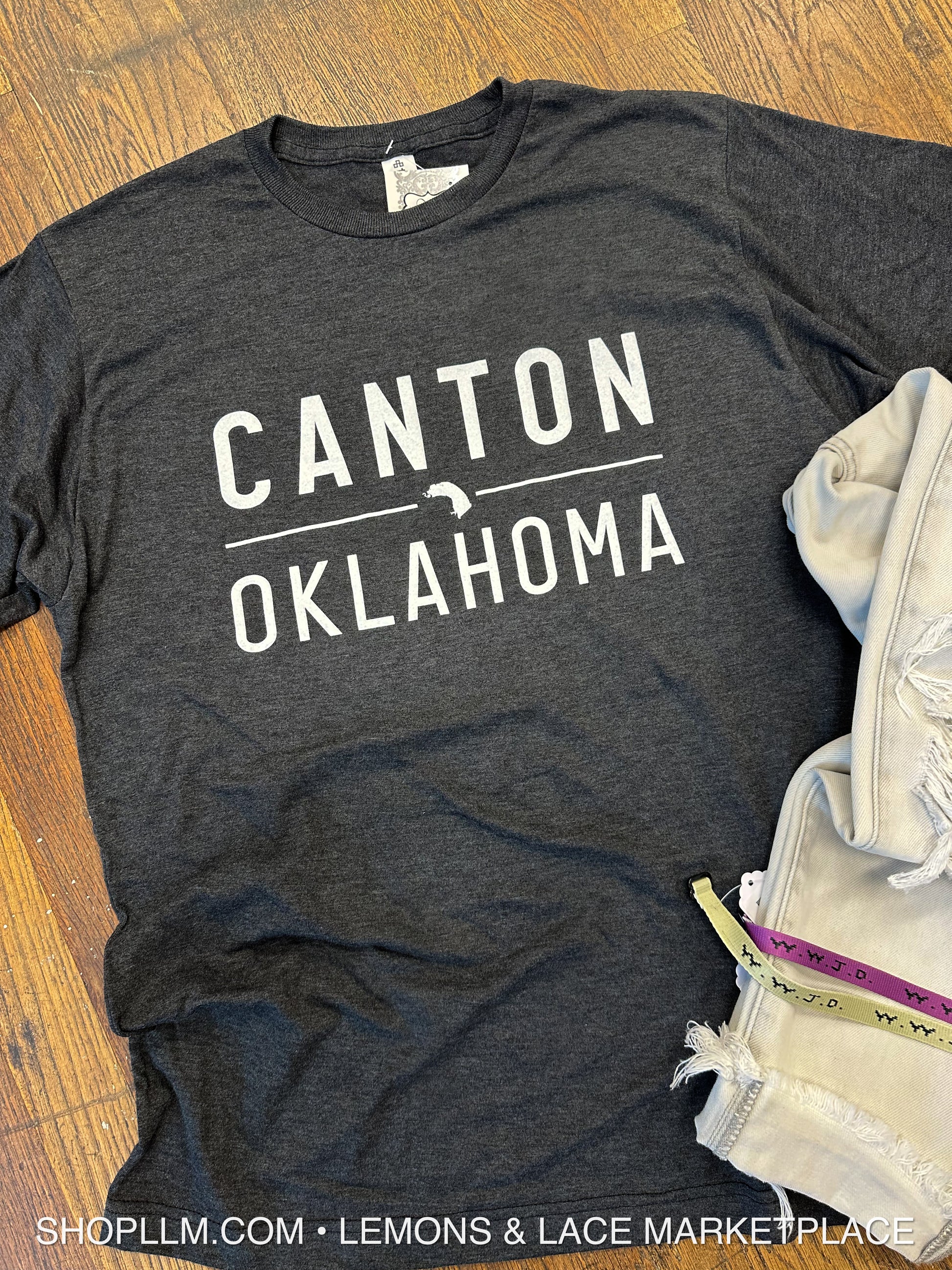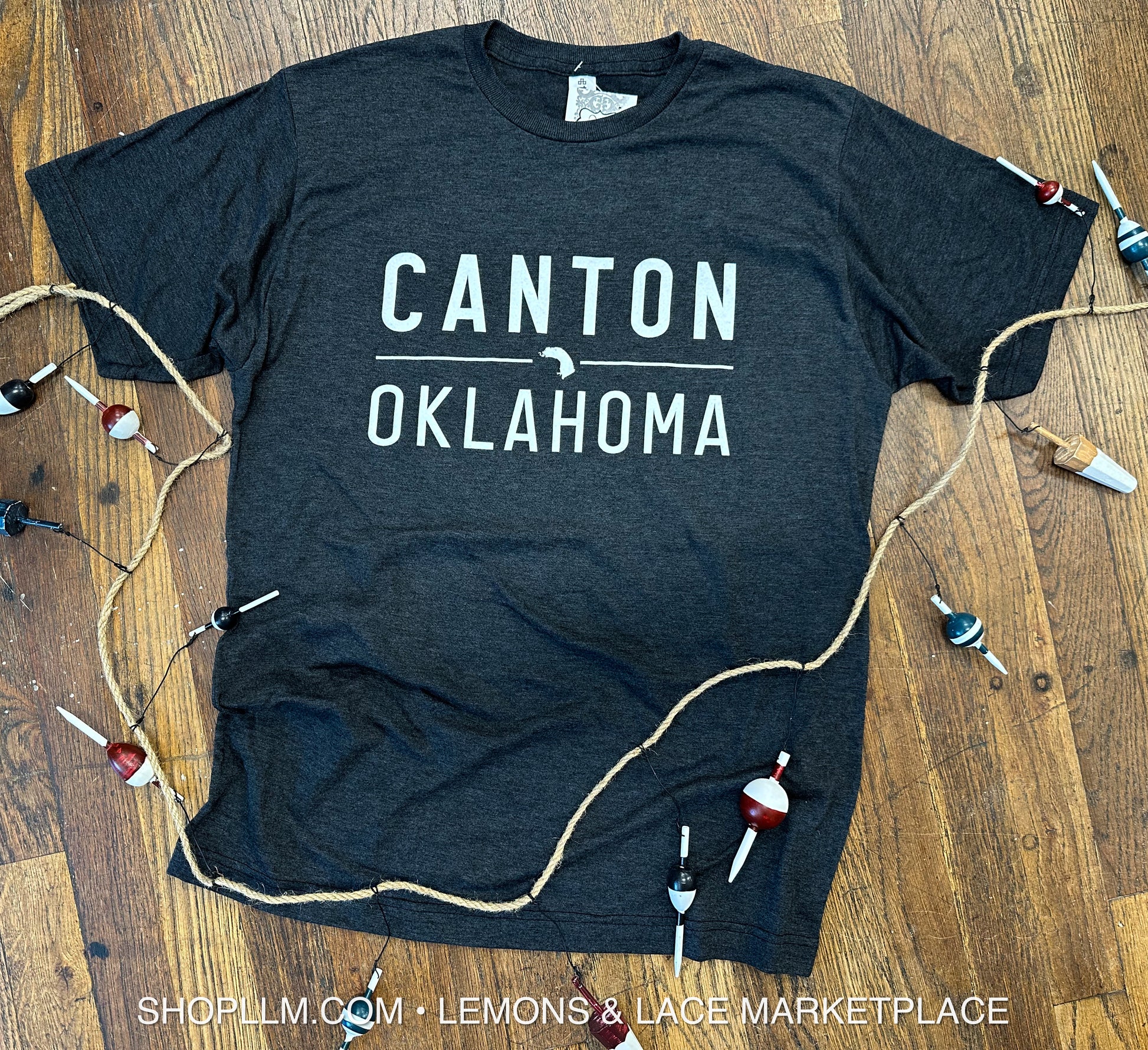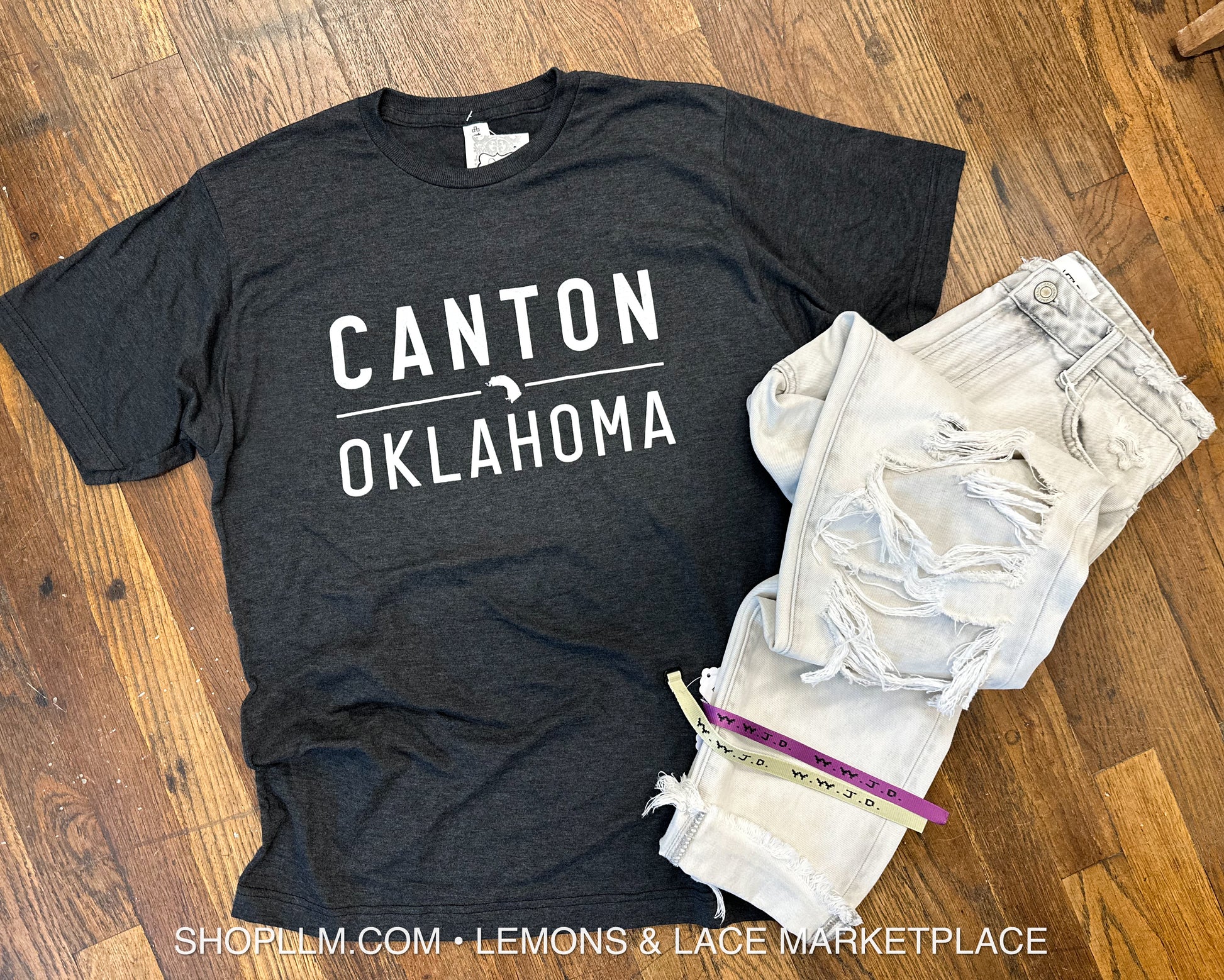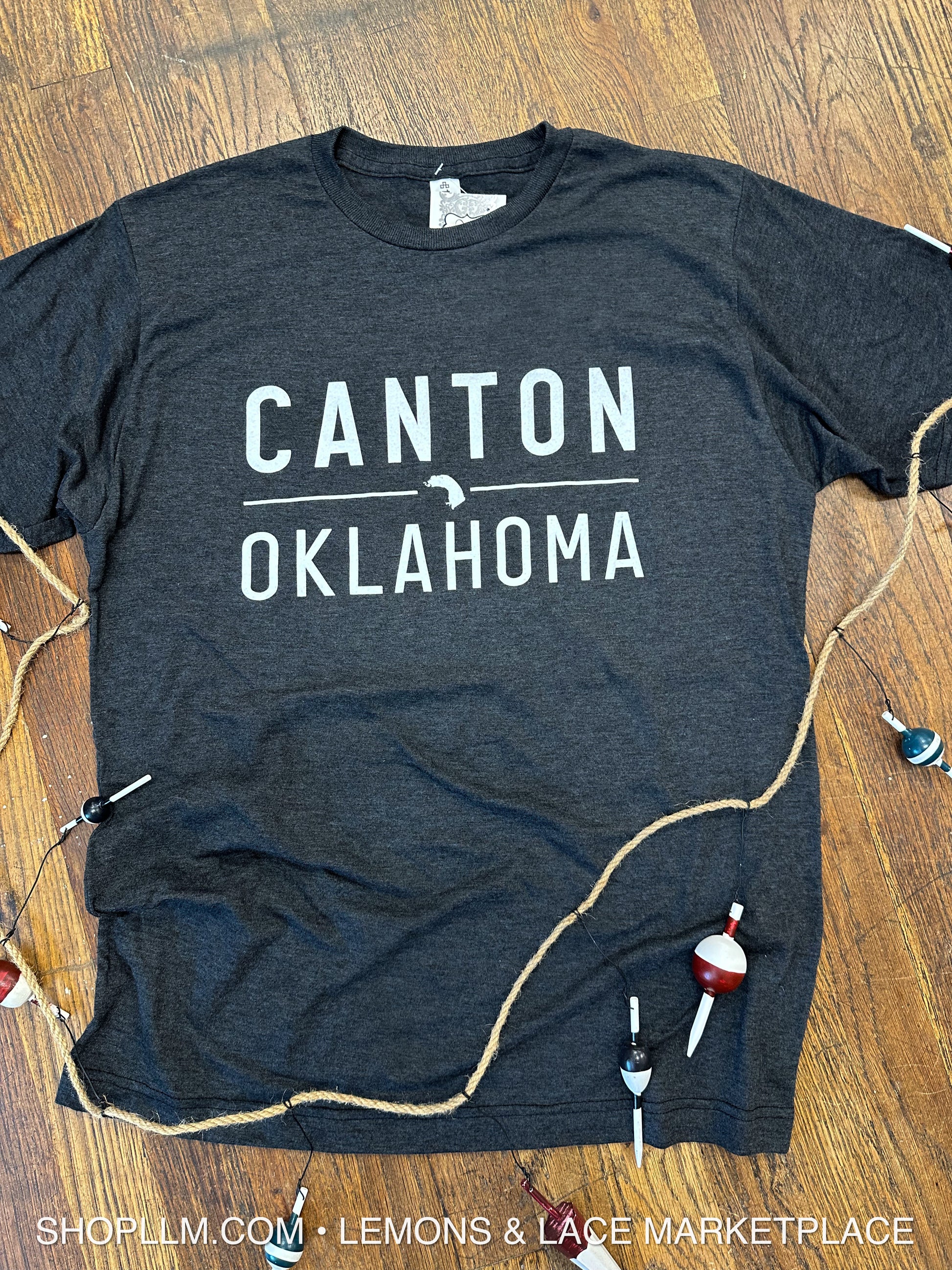 Unisex style tee with screen printed Canton Oklahoma in White. Small Canton Lake symbol in between the wording.