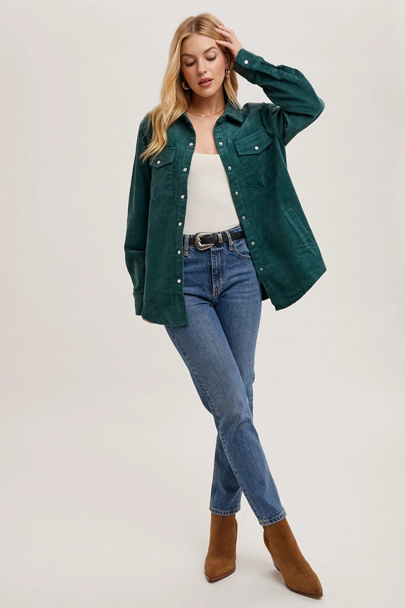 The corduroy button-down shacket with side pockets combines the structure of a jacket with the ease of a shirt, making it a versatile addition to your wardrobe. Made from soft, durable corduroy, this shacket features a button-down front, giving it a classic look that's easy to layer over any outfit.