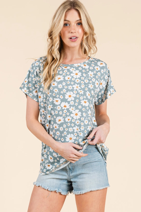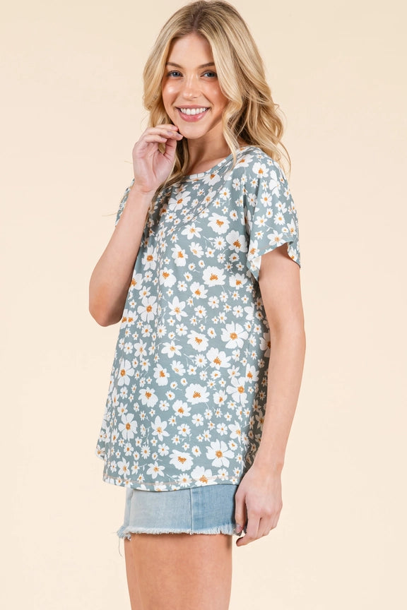 Freshen up your wardrobe with this charming daisy-print top! Featuring a soft sage green background with an all-over white and yellow daisy pattern, this top is the perfect mix of cute and casual. The relaxed fit and flowy design make it super comfortable for all-day wear.