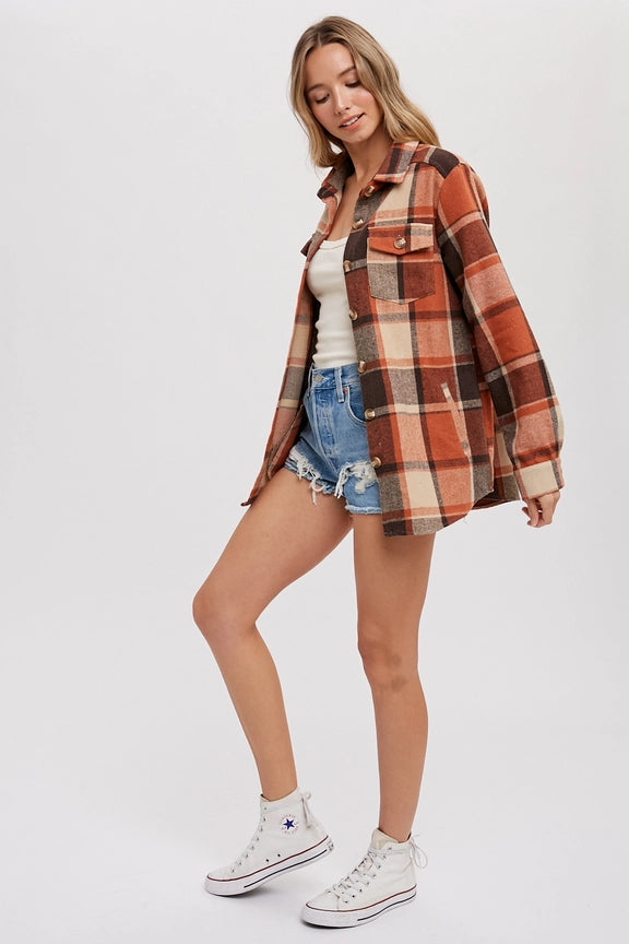 Introducing a classic and cozy flannel plaid shacket that seamlessly combines style and comfort. This shacket features a button-down front for easy wear and adjustability, and it's adorned with a timeless plaid pattern that adds a touch of traditional charm.