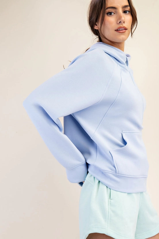 Crafted from a luxurious, silky smooth fabric, this cropped jacket is super soft and lightweight, providing a delightful sensation against your skin. The oversized fit exudes casual chic, while the half zipper closure adds a stylish touch. With a convenient kangaroo pocket and thumbhole details, this jacket effortlessly combines fashion and functionality.