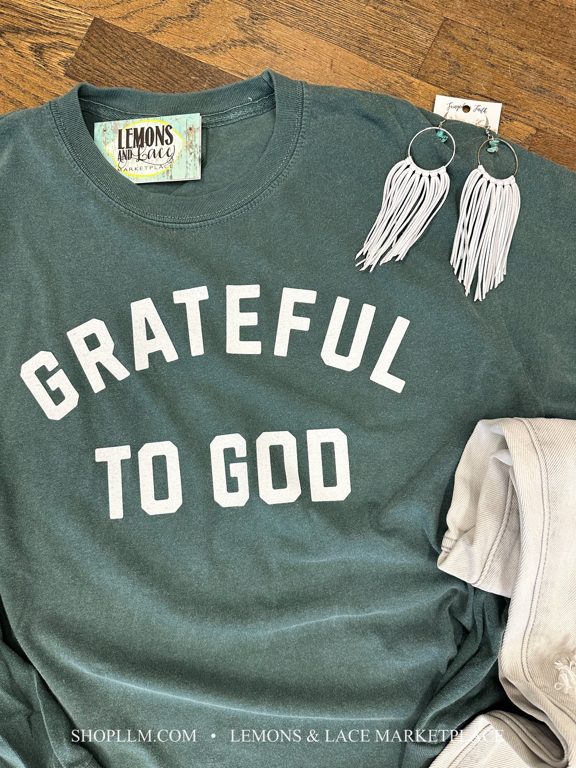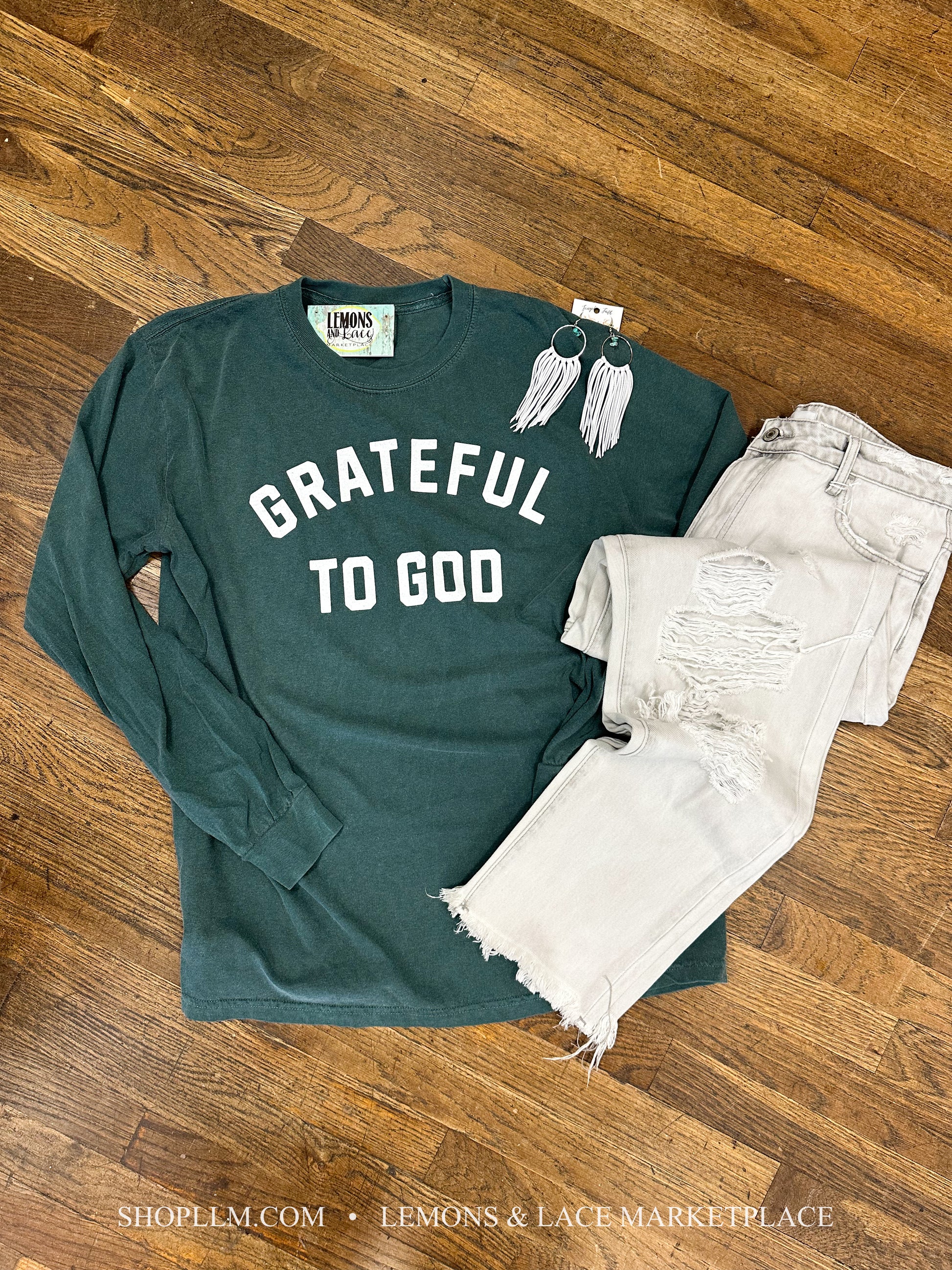 Beautiful emerald green long sleeve unisex tee, with "Grateful To God" screen printed on the front.