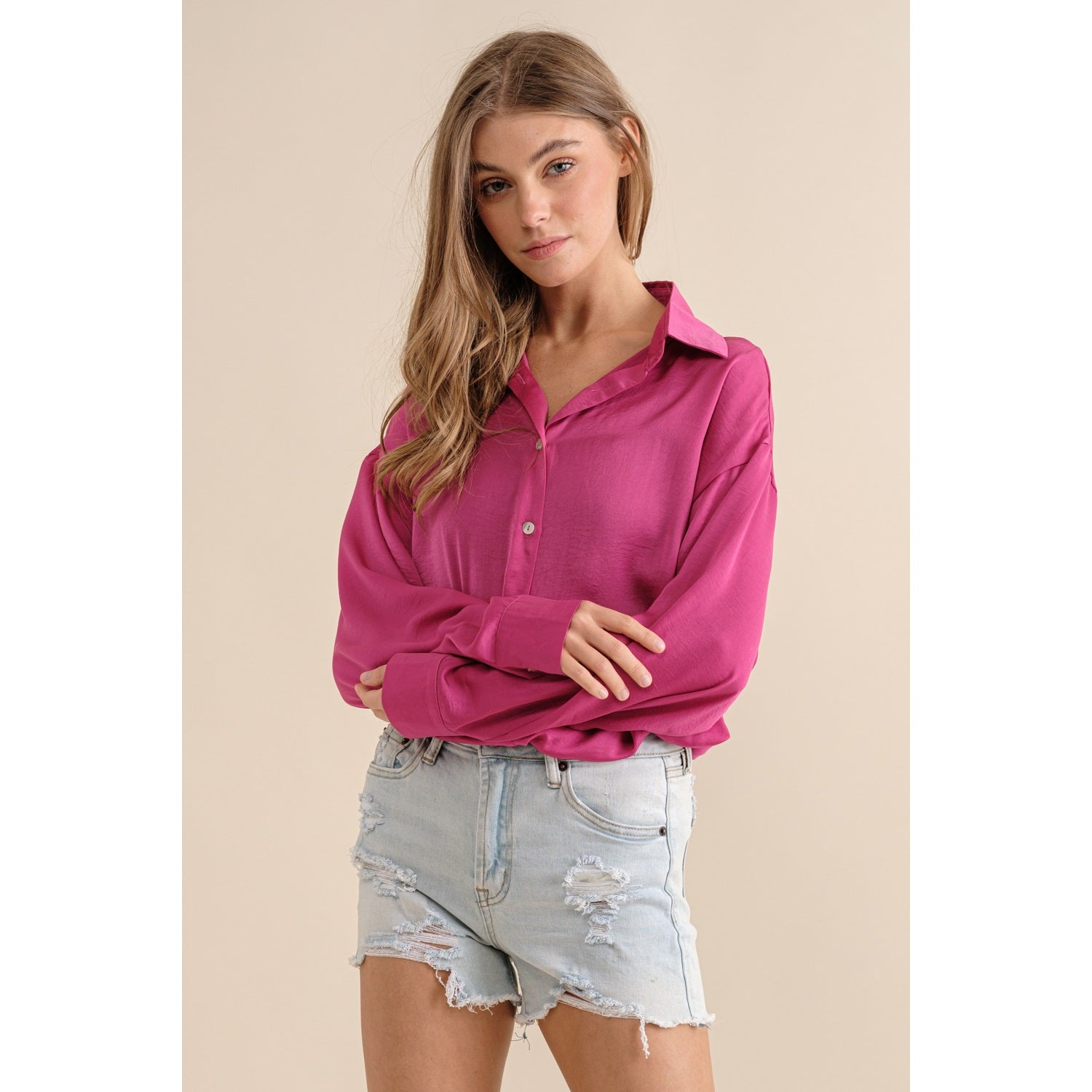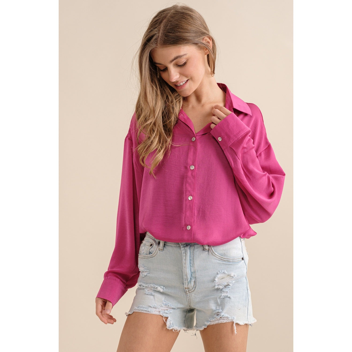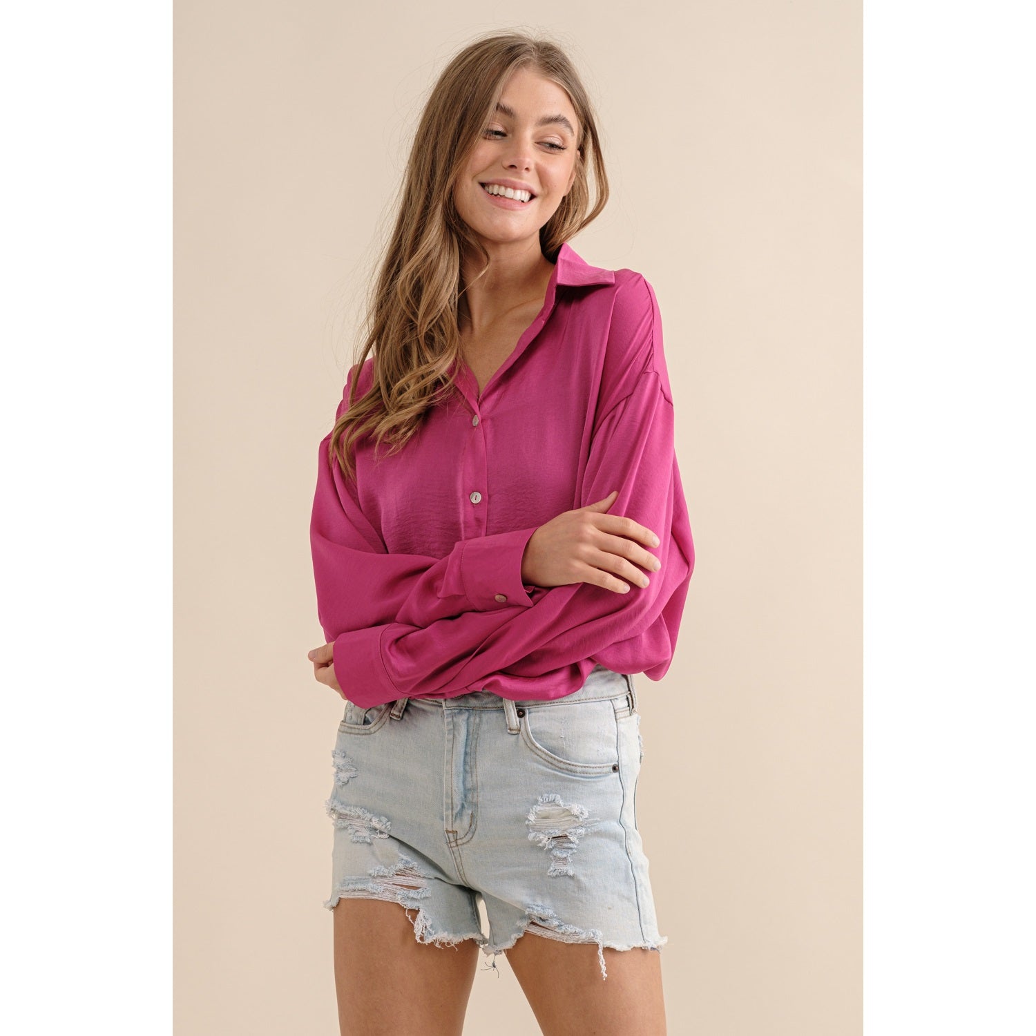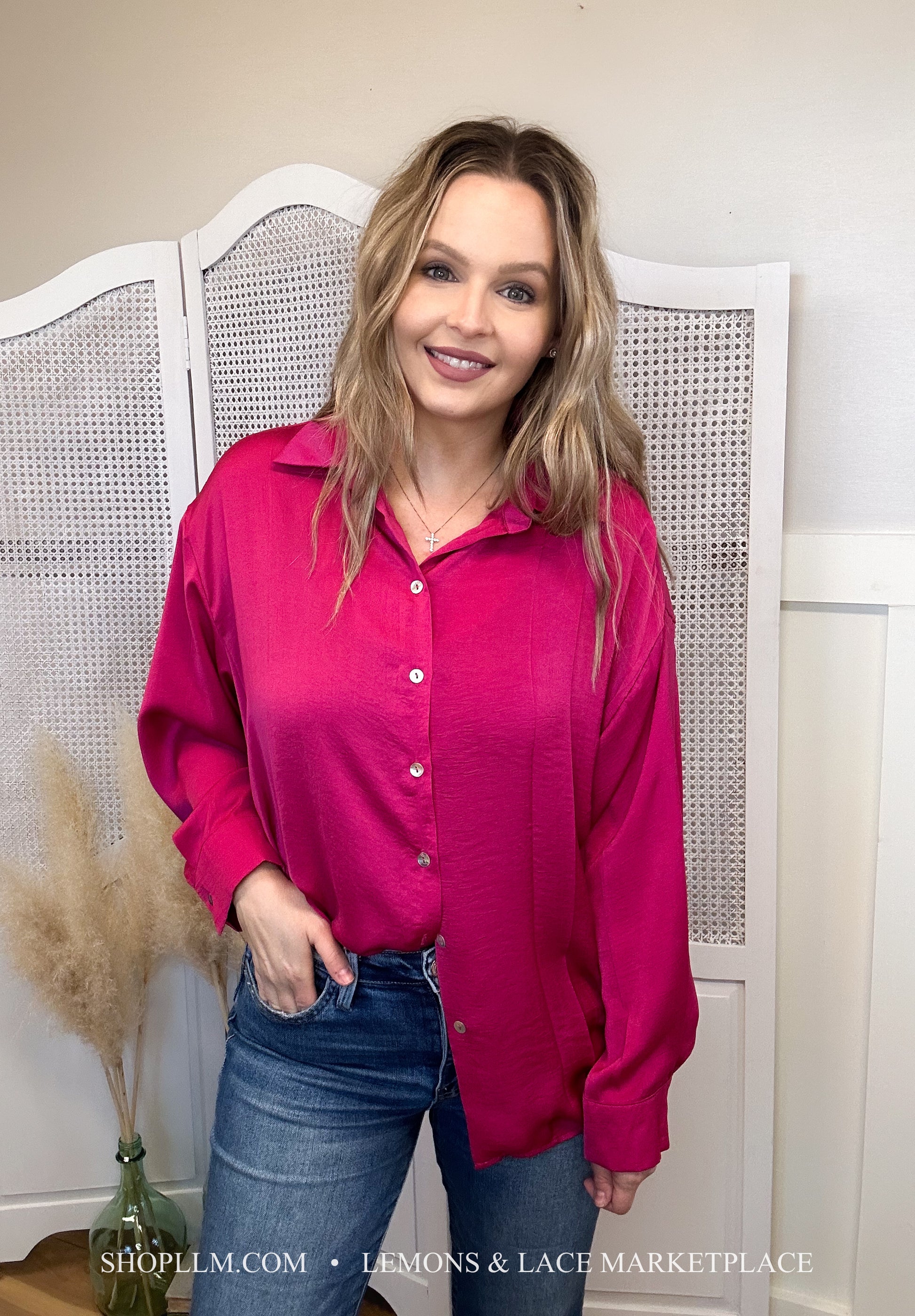 Sassy but cute in this hot pink button down. Light satin materials, are so soft and beautifully paired with any bottoms. Dress up or down!