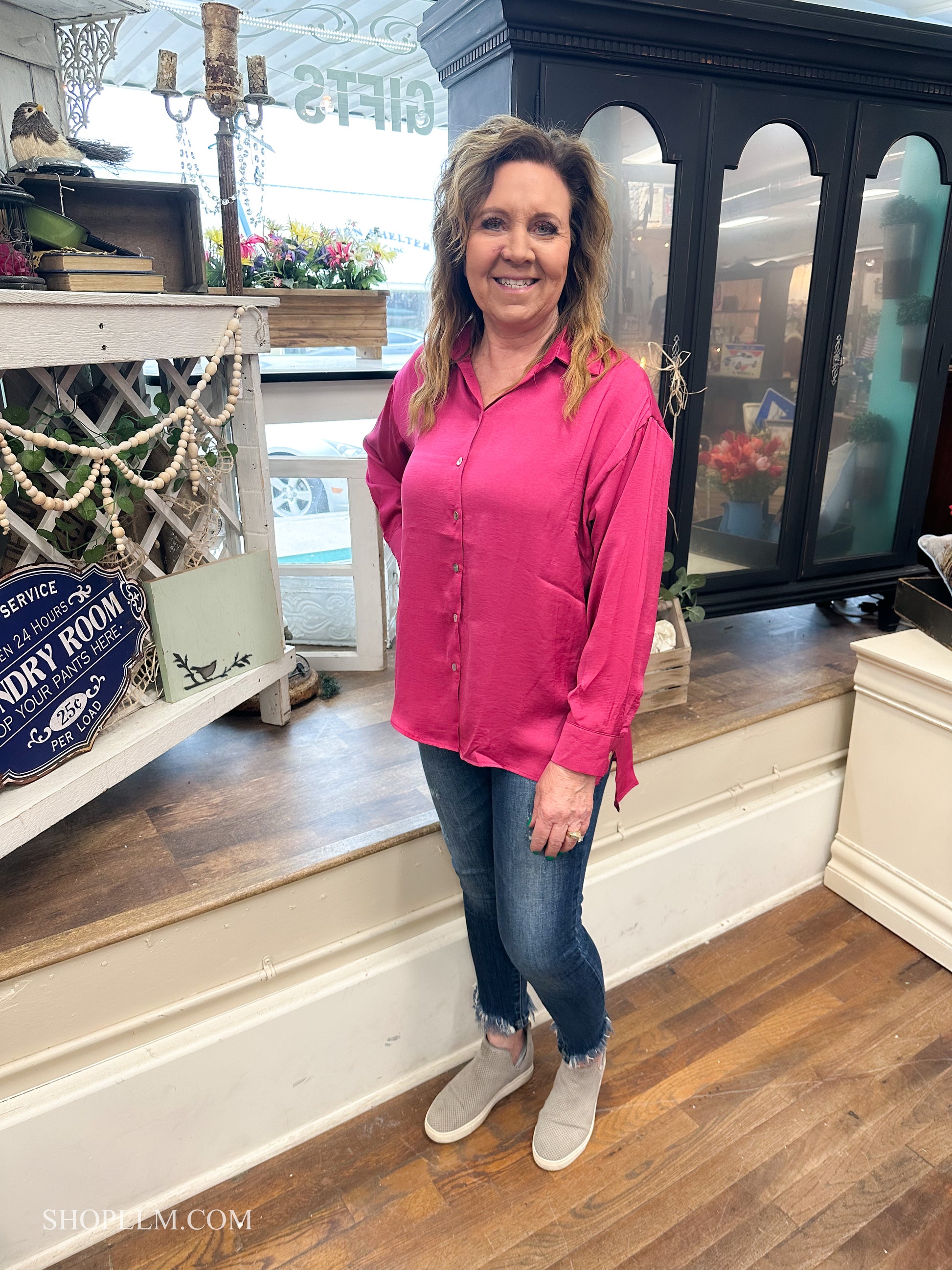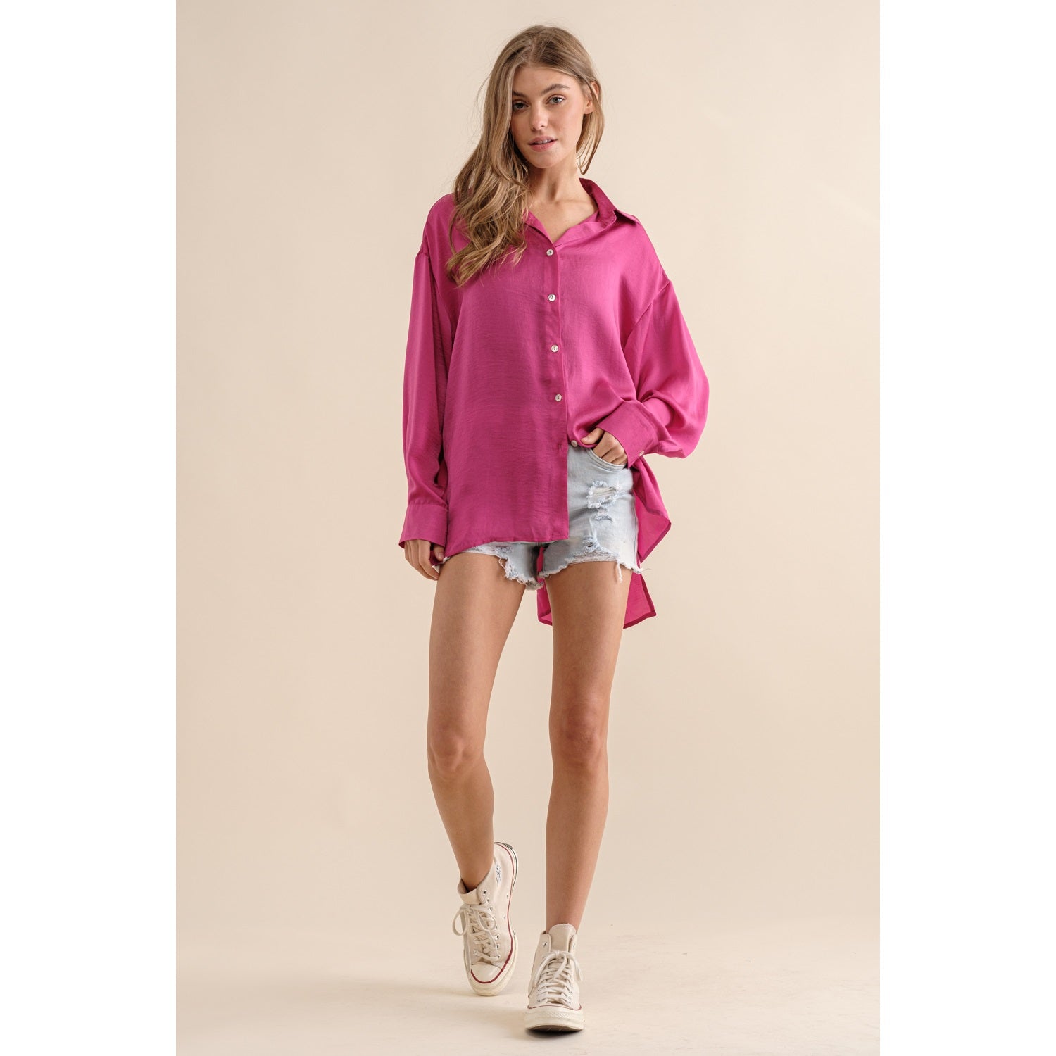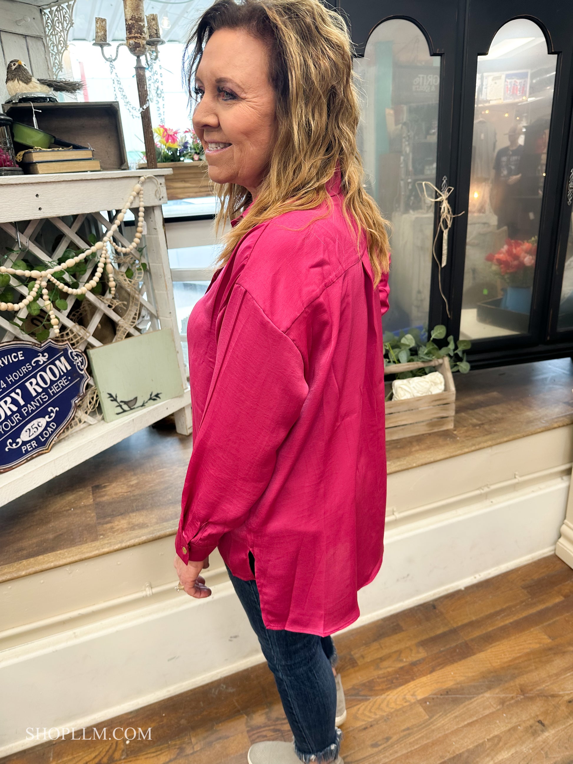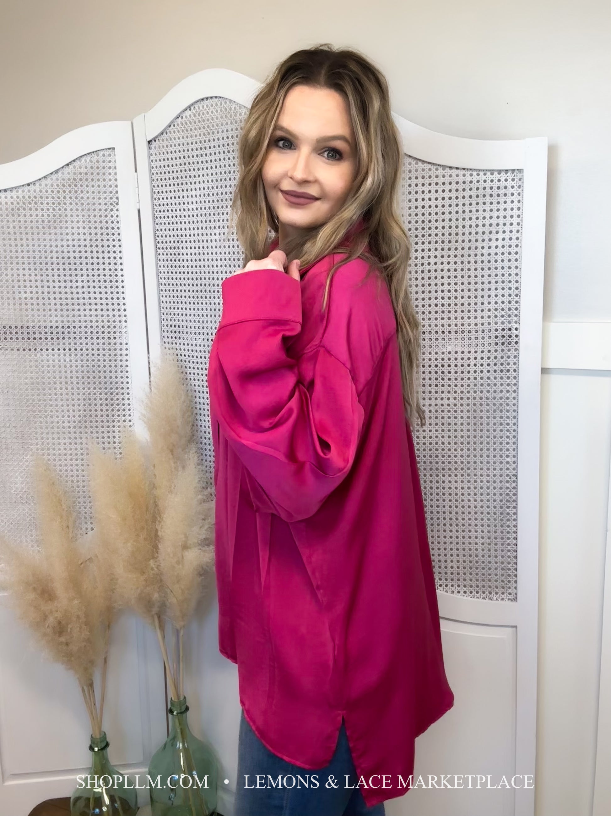 Sassy but cute in this hot pink button down. Light satin materials, are so soft and beautifully paired with any bottoms. Dress up or down!