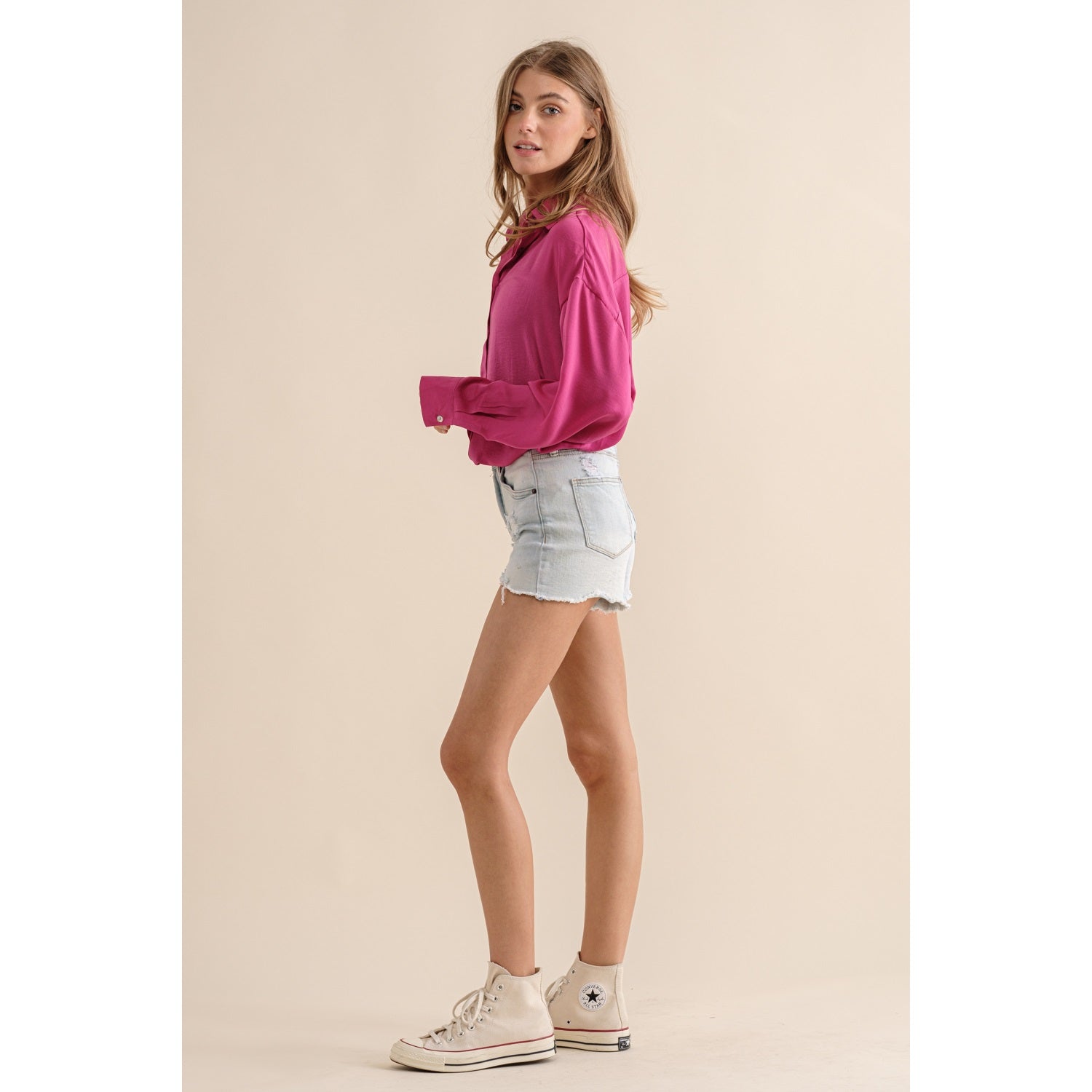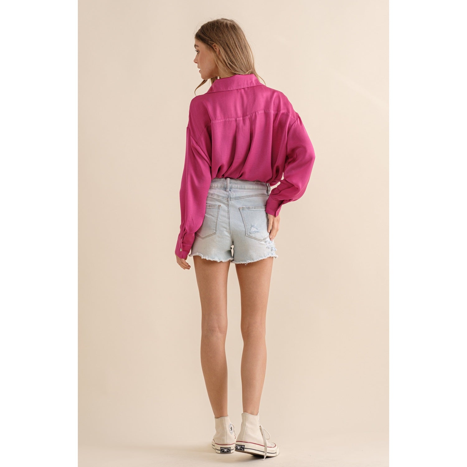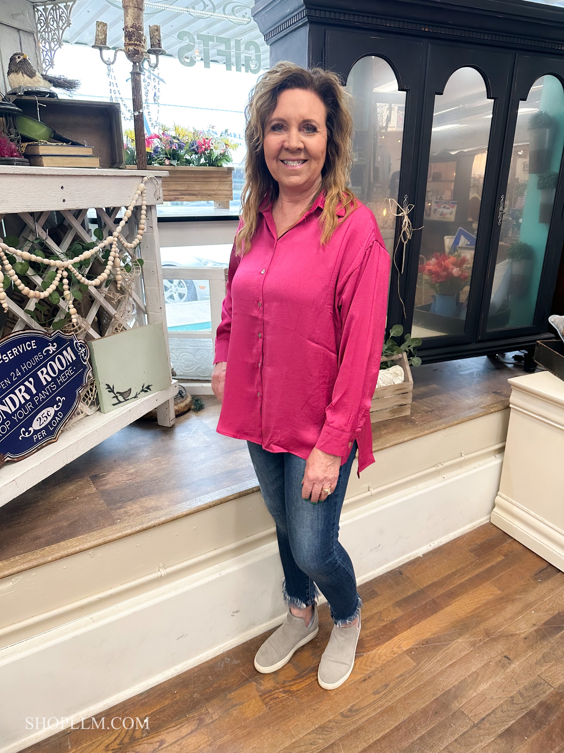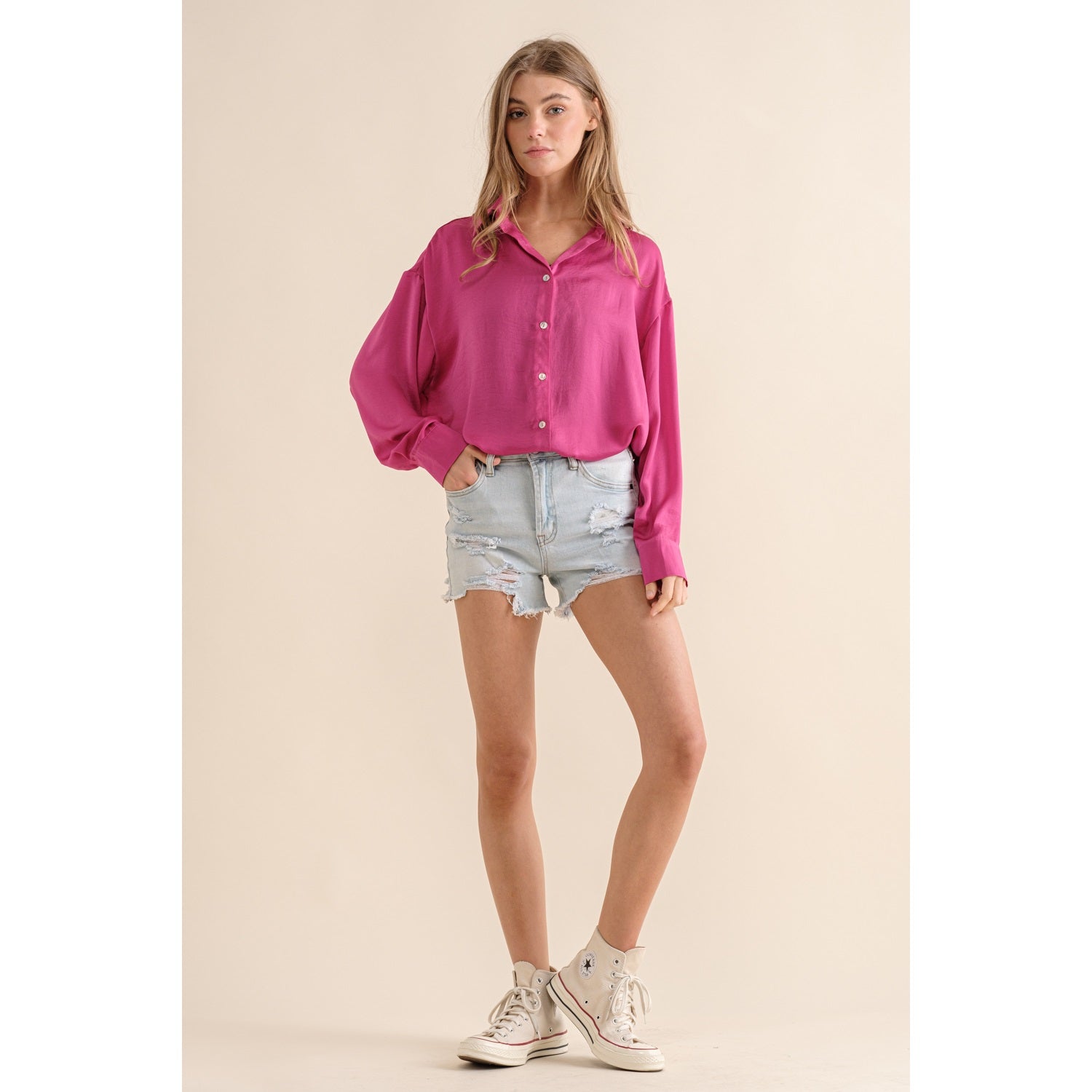 Sassy but cute in this hot pink button down. Light satin materials, are so soft and beautifully paired with any bottoms. Dress up or down!