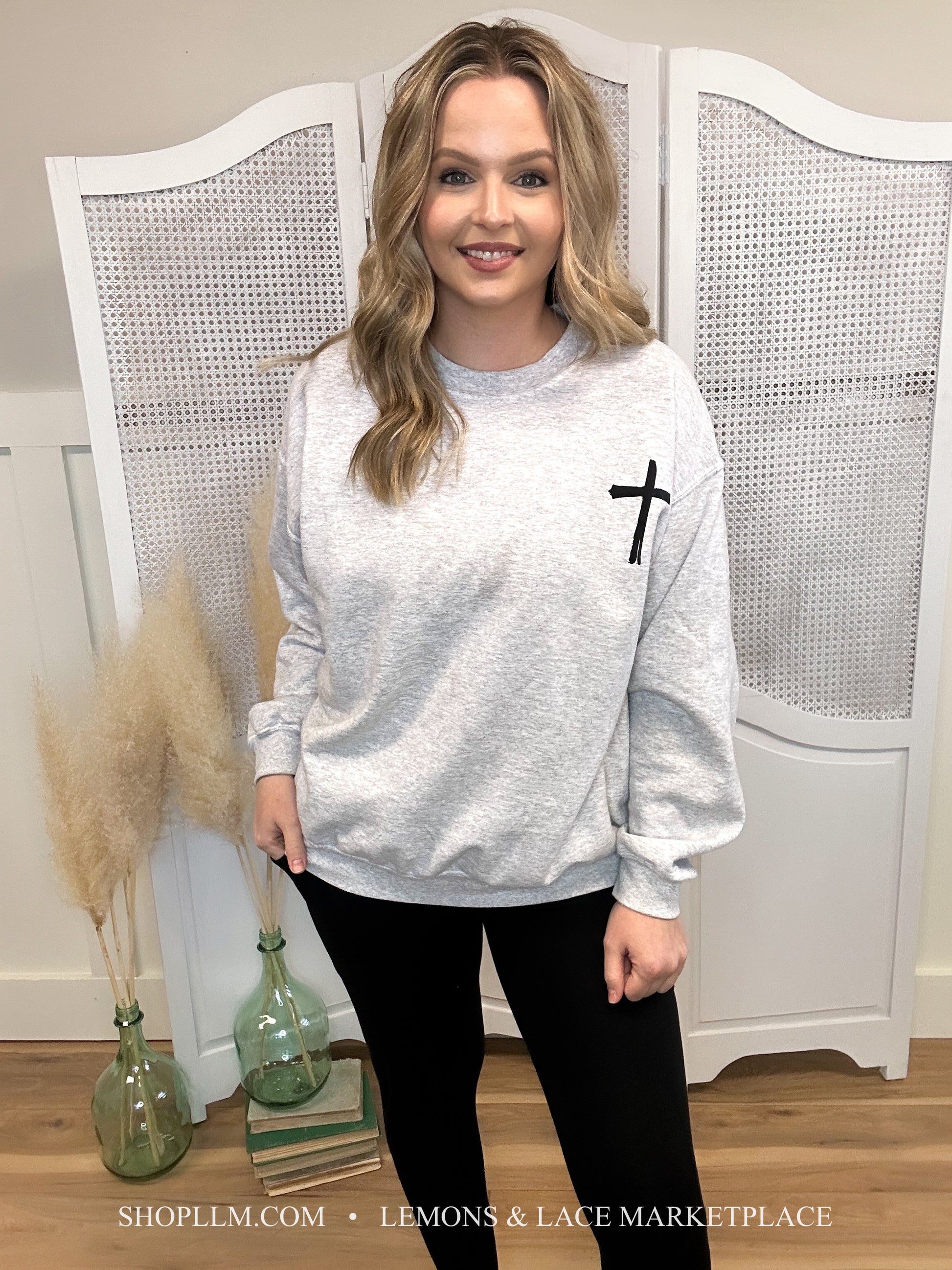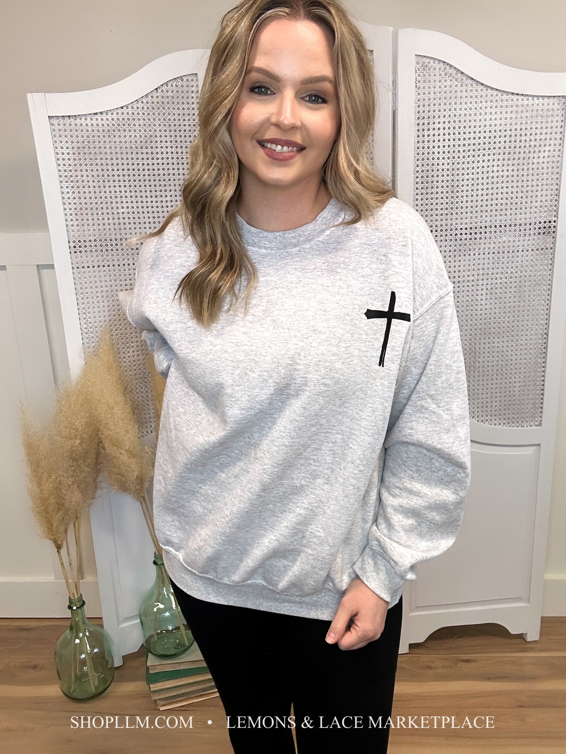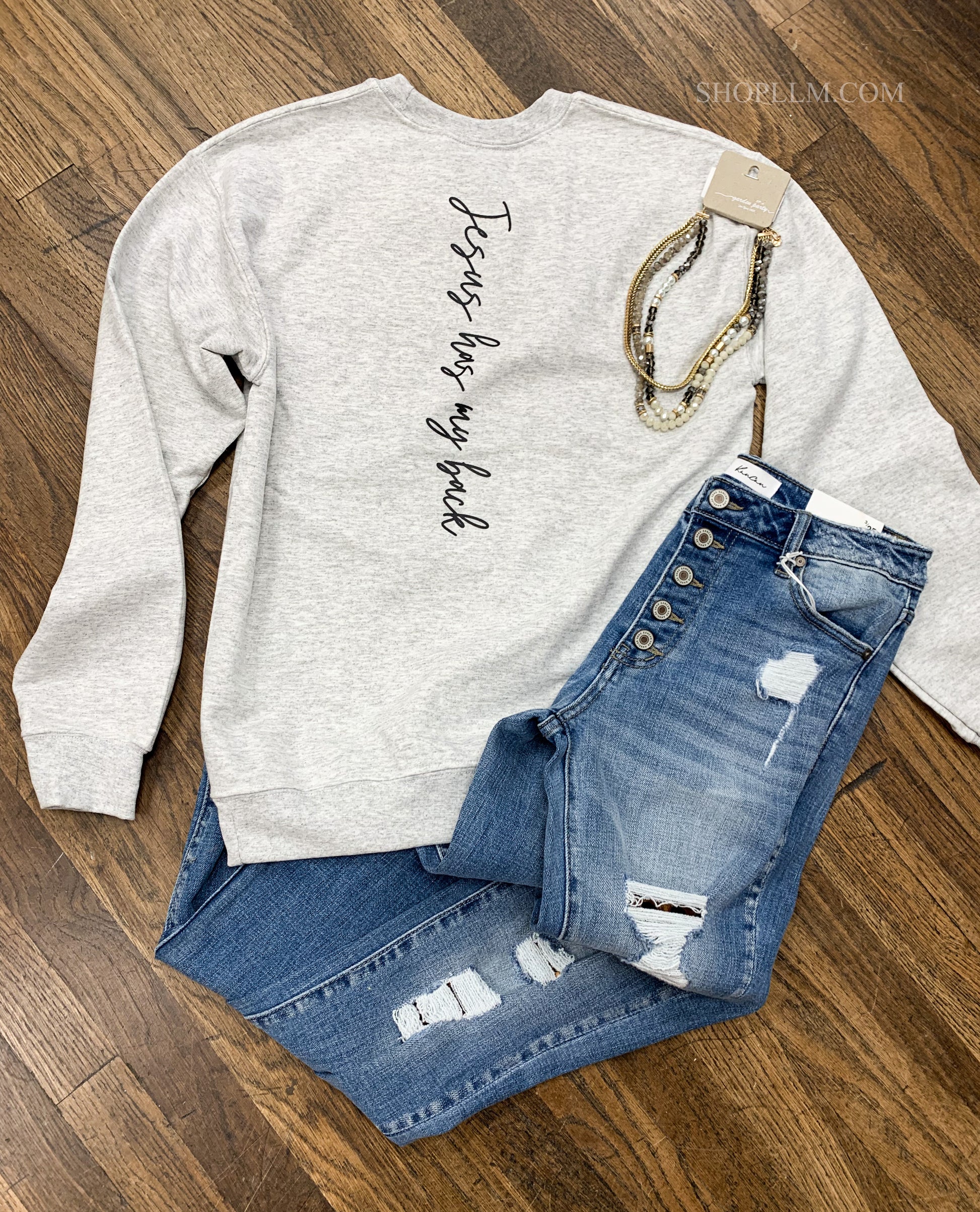 Fun comfy sweater with “Jesus Has My Back” printed on the back and a cross printed on the front right chest.