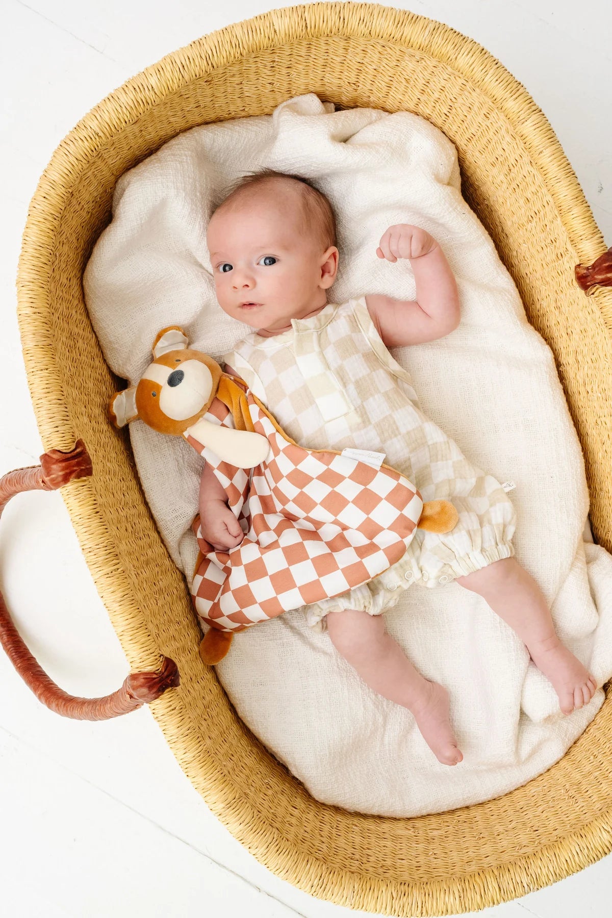 Just the right size to take on the go, this snuggly lovey features a squishy head, and a super-soft fabric to comfort baby.