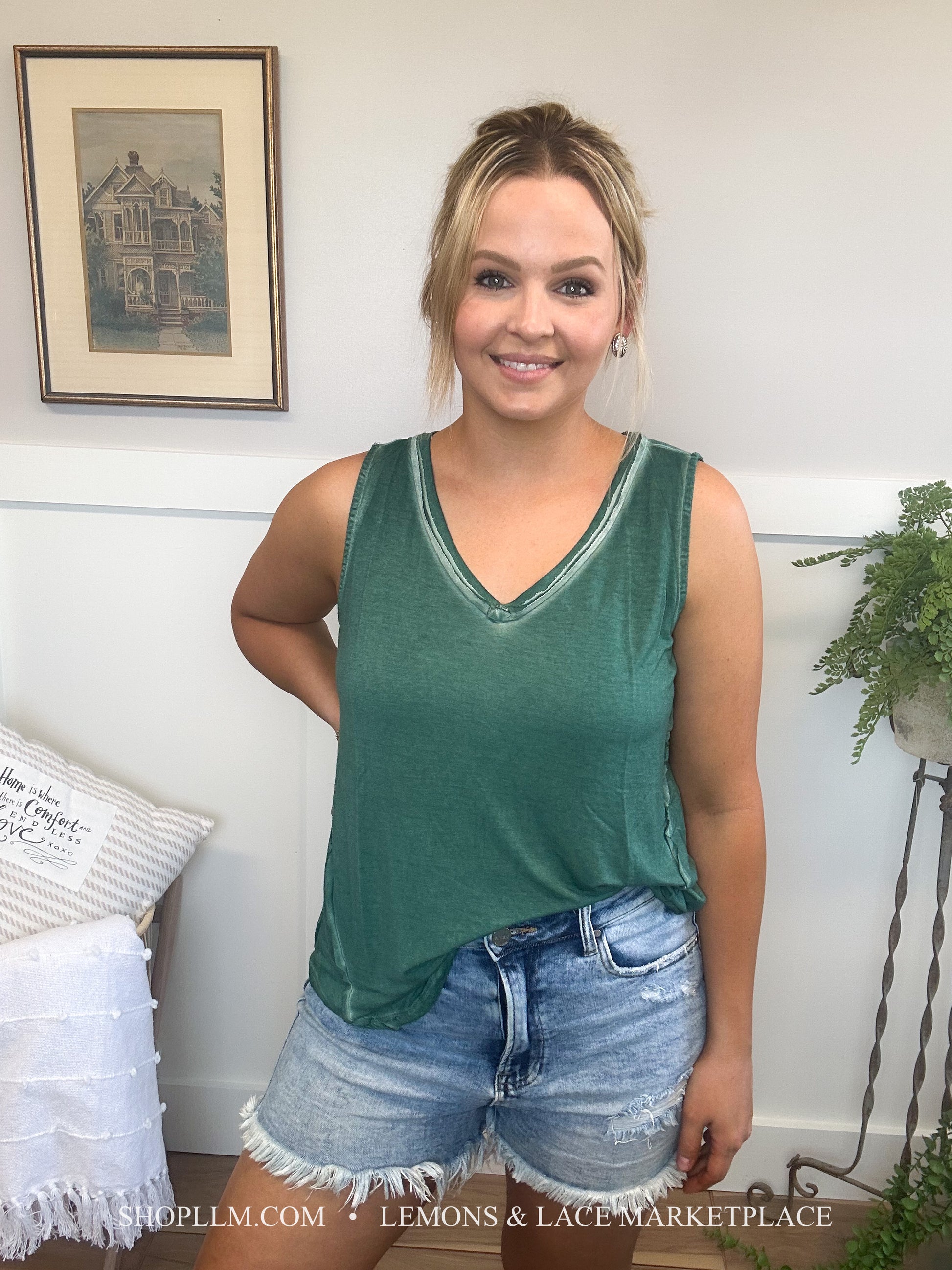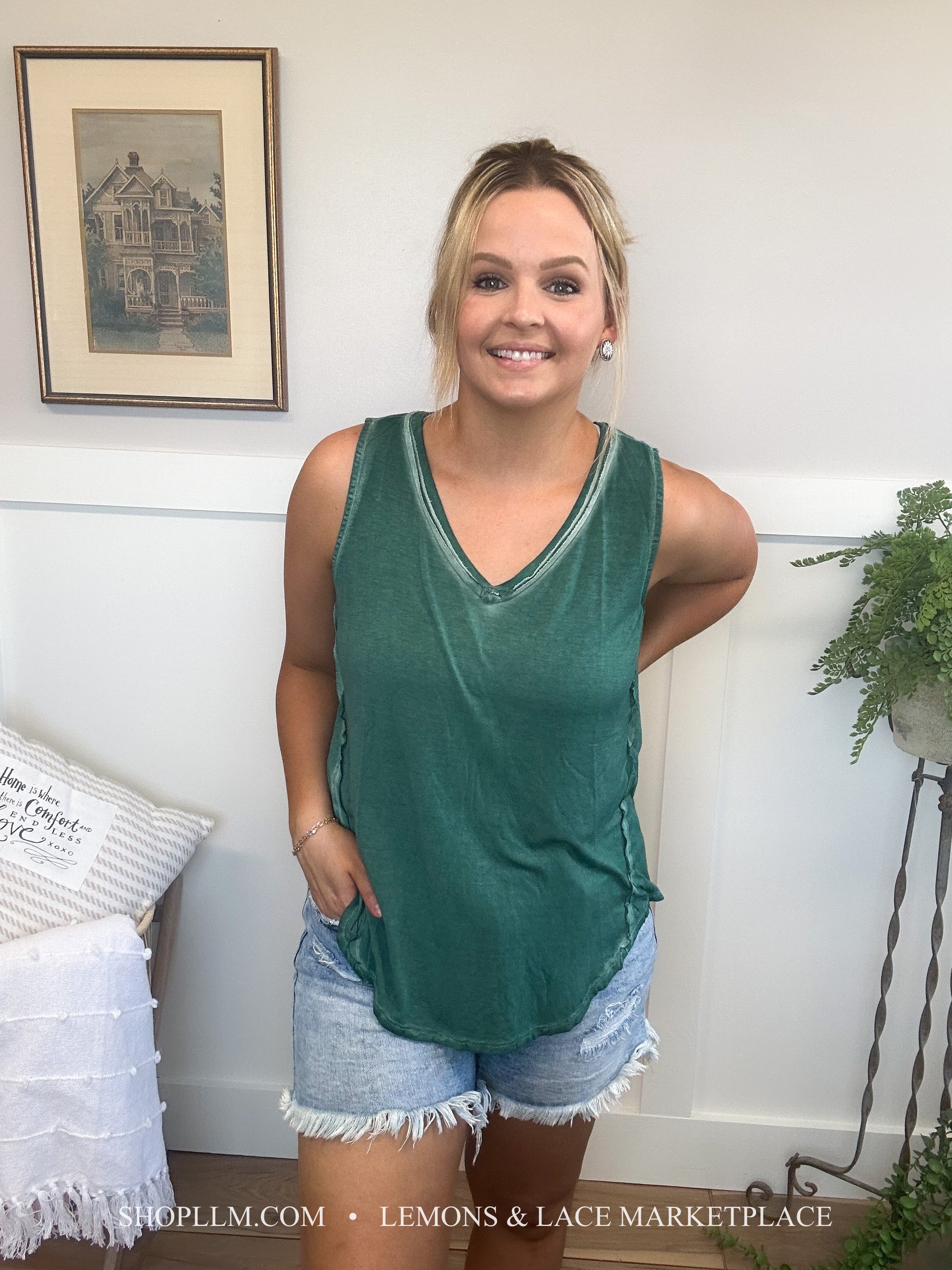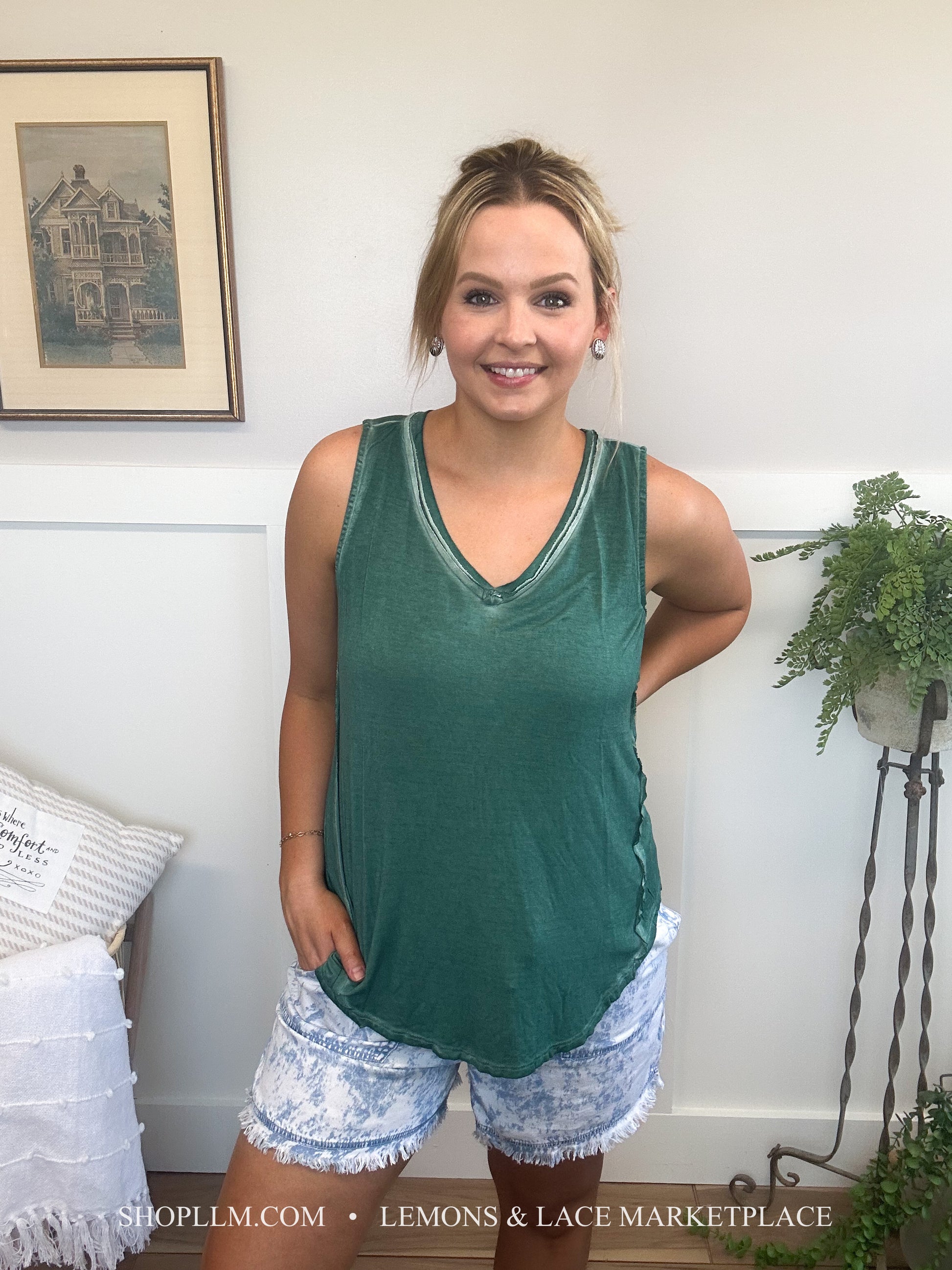 Pair with anything! This washed tank would be great for spring and summer days, throw a shacket on for cool spring mornings. Fun sleeveless v-neck top with a high low hem, back tag detail.