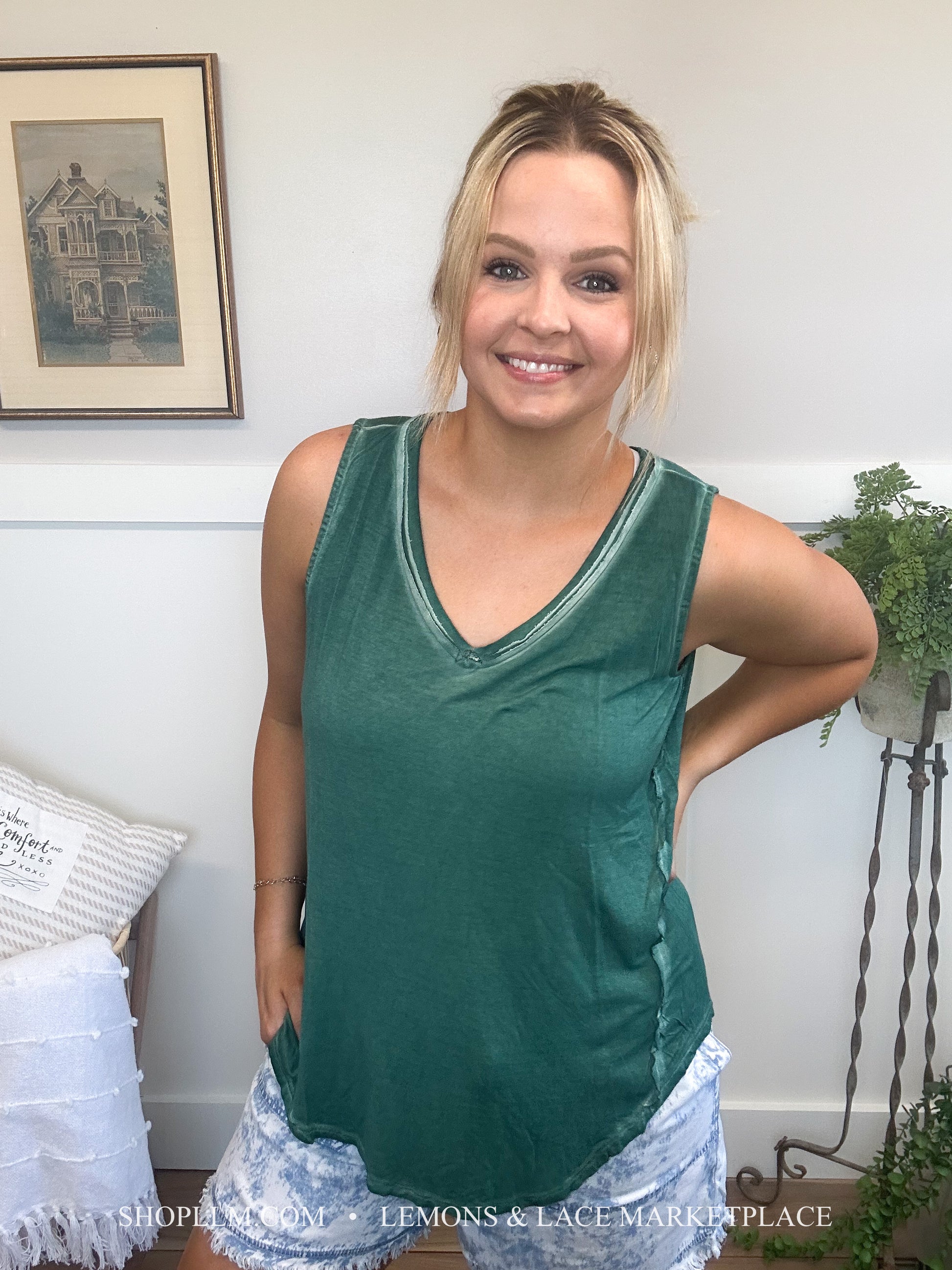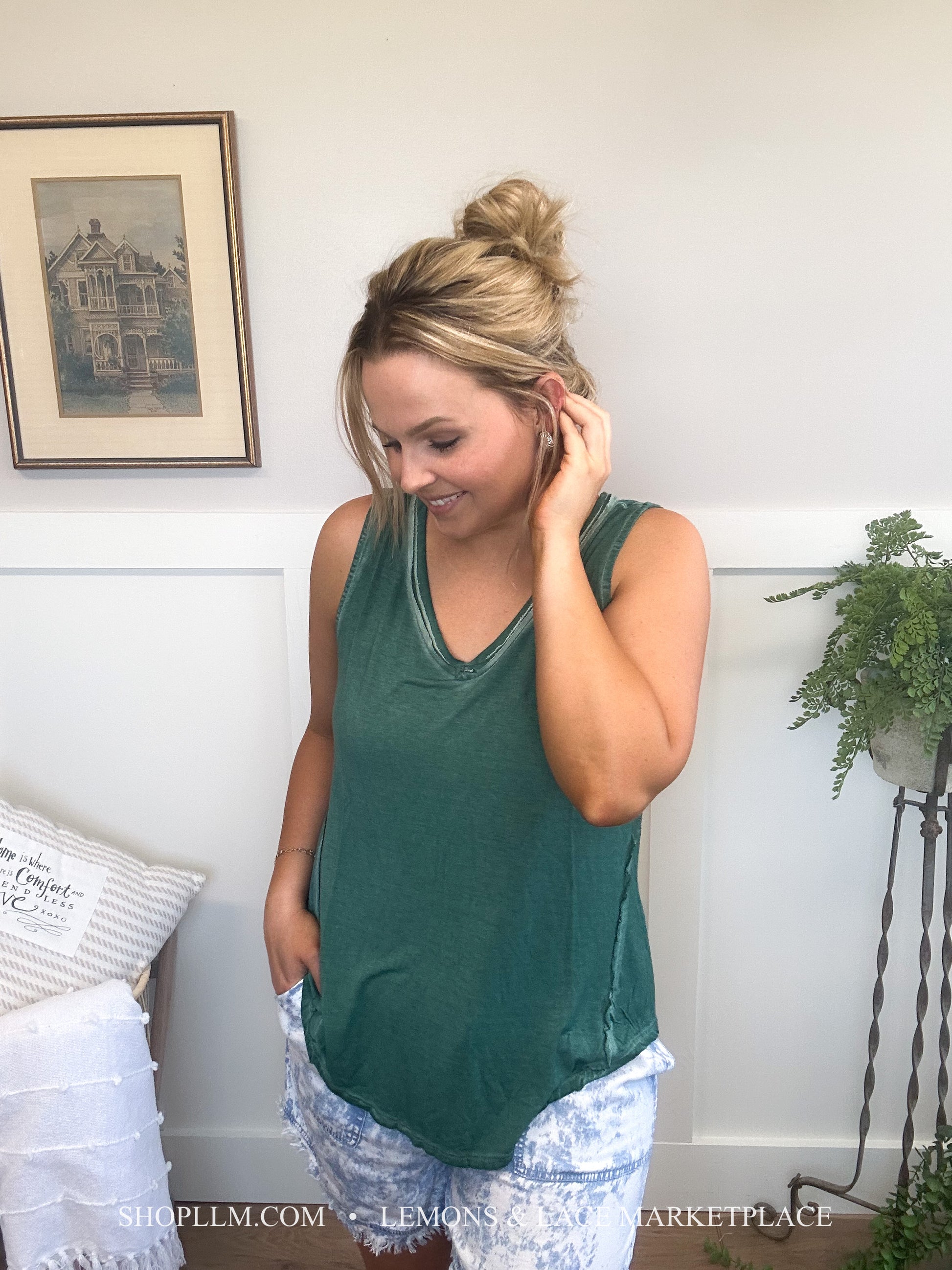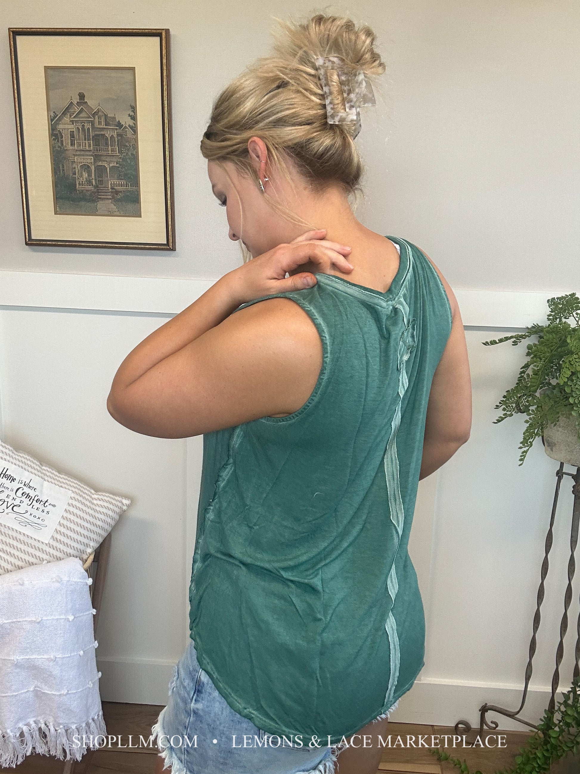 Pair with anything! This washed tank would be great for spring and summer days, throw a shacket on for cool spring mornings. Fun sleeveless v-neck top with a high low hem, back tag detail.