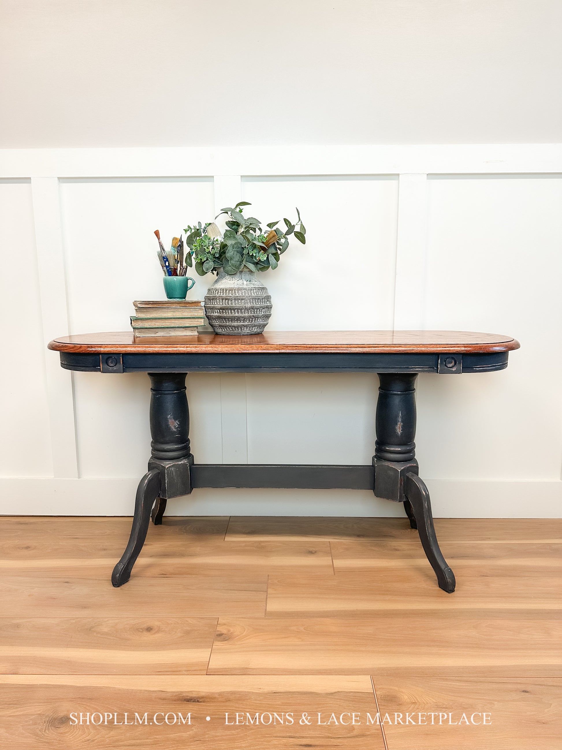 Painted in layers of Chicago Grey and Graphite Annie Sloan Paint, fun two color distressing to add details to the bones of the table. Piece is sealed in Clear Wax. Professionally refinished by Joni with Flipping Lemons.