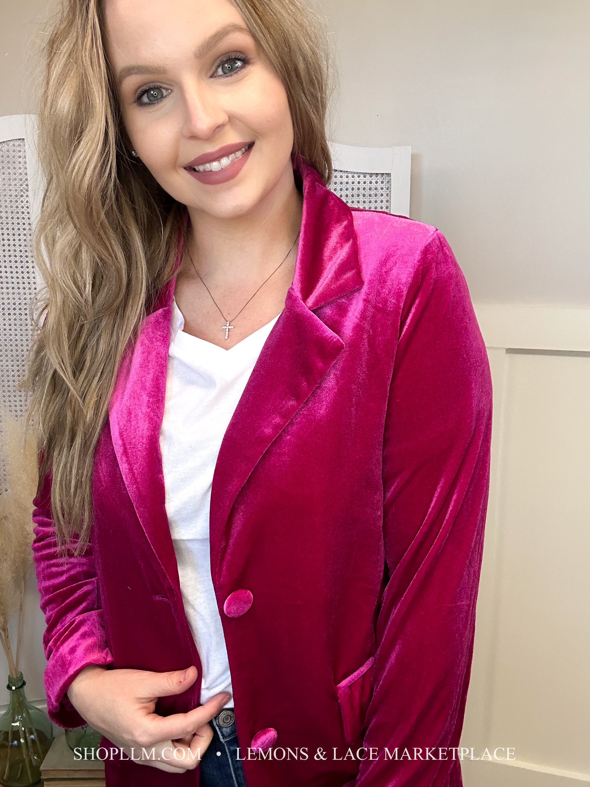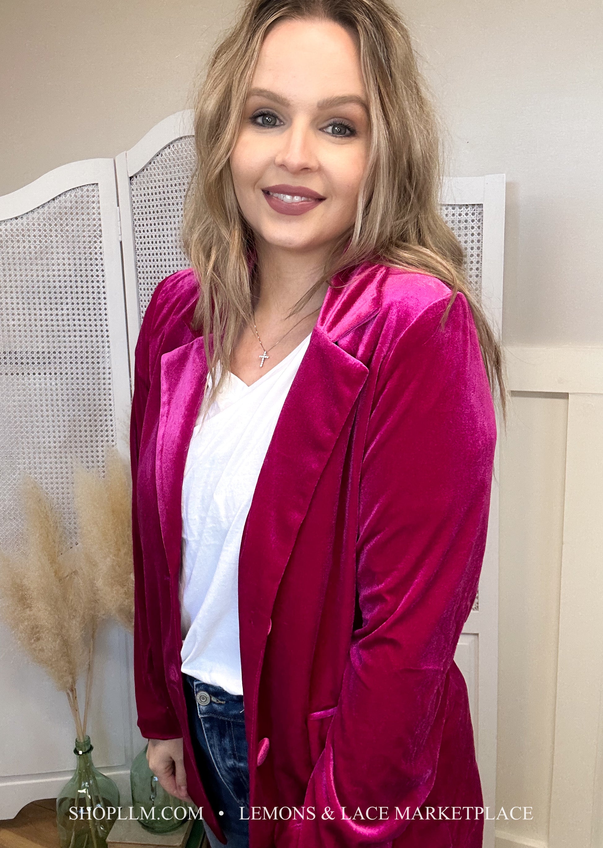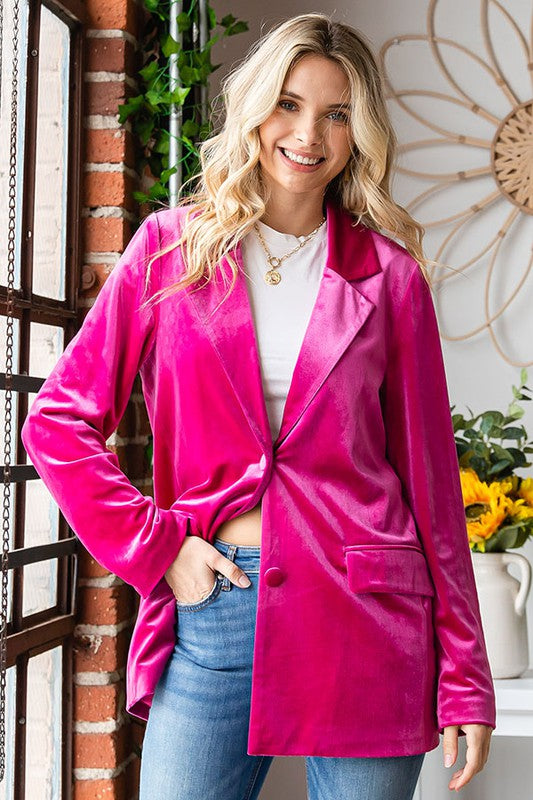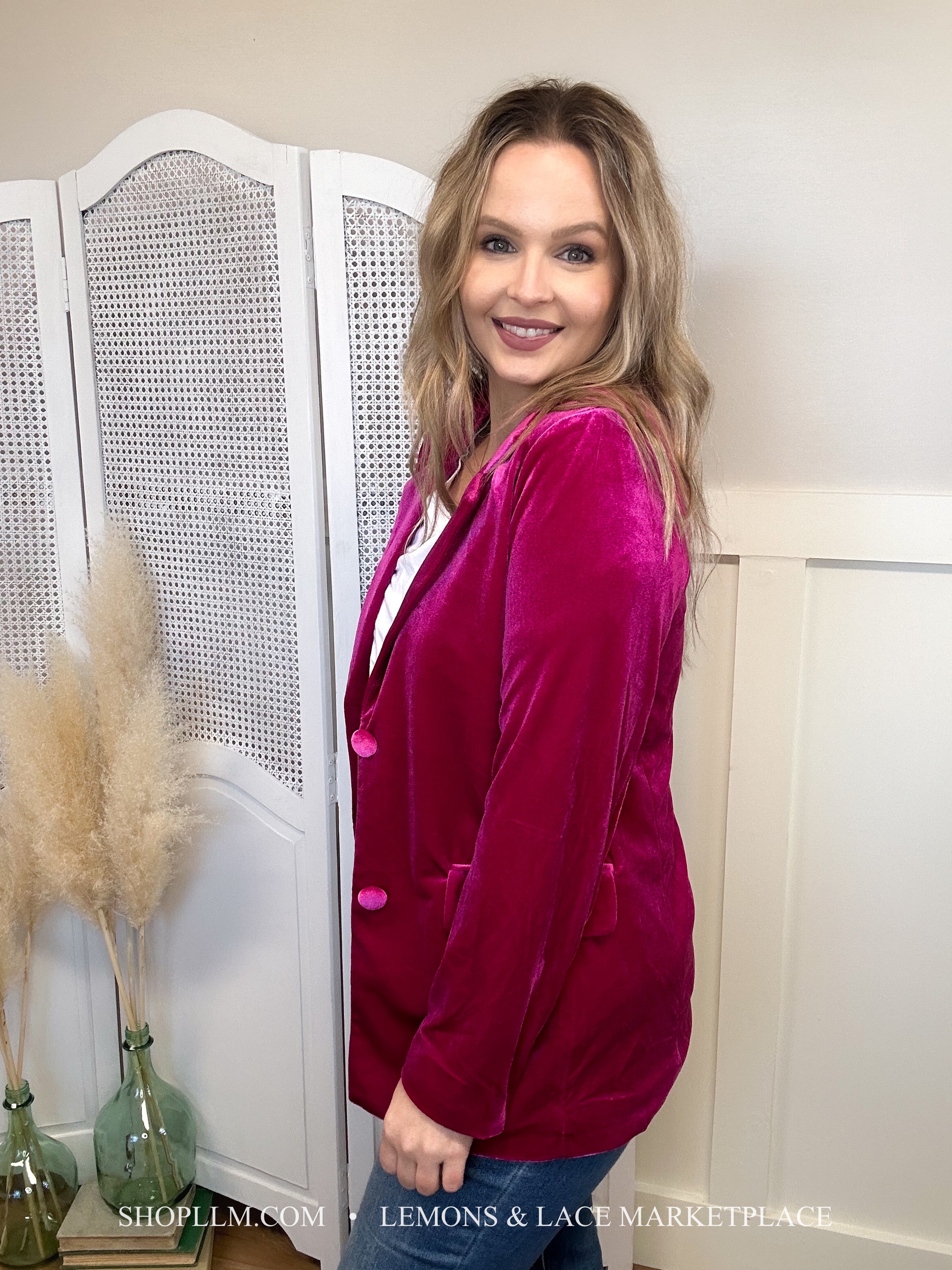 Take my money! This blazer is an eye catcher. You will make a statement with this fun velvet button down blazer. It has two pockets on the front for functionality.