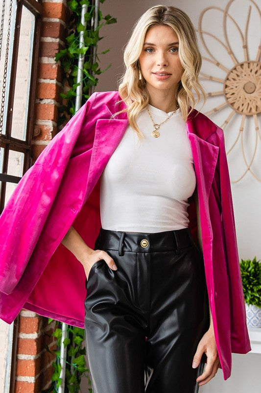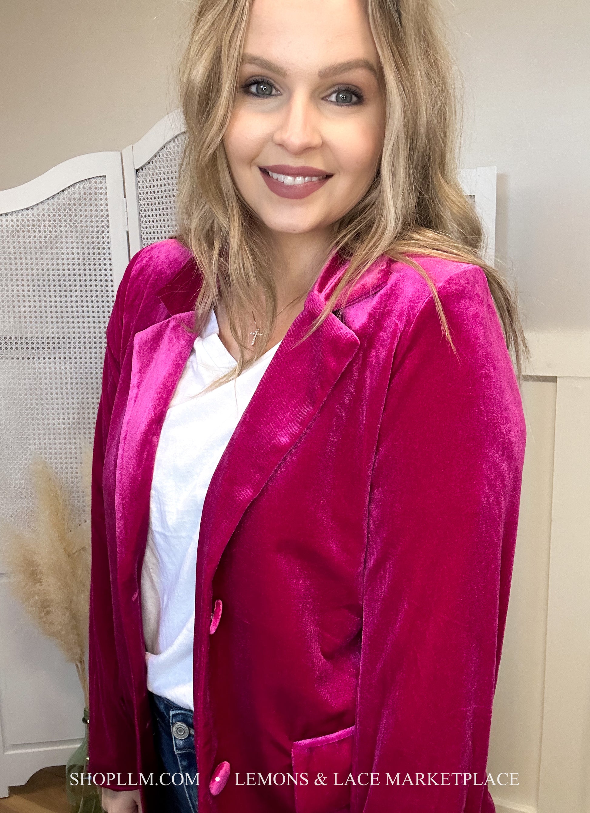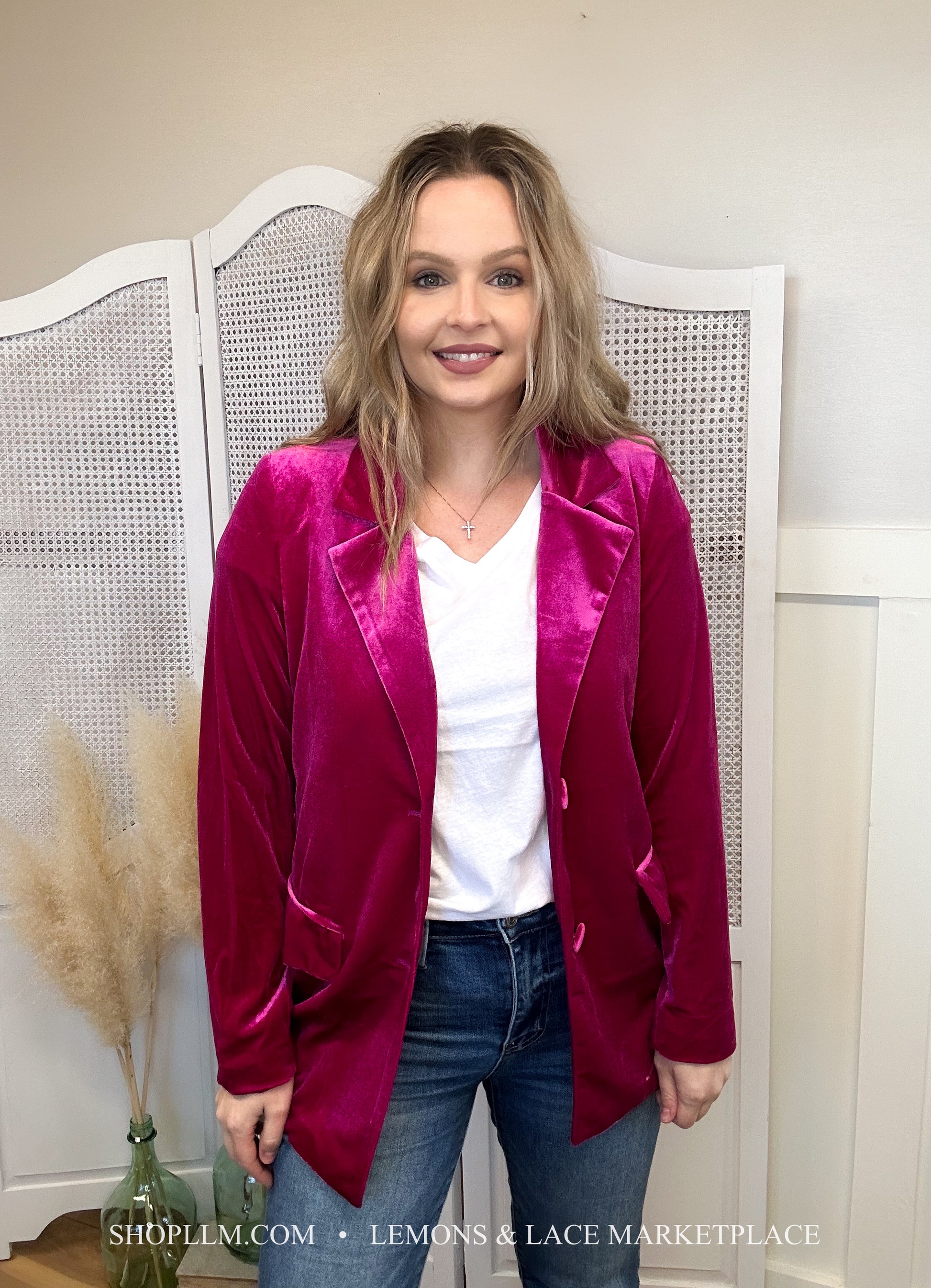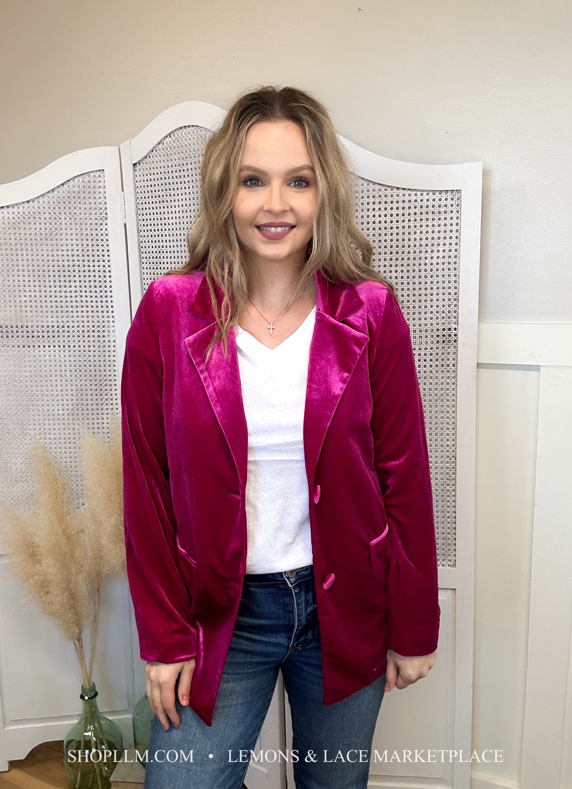 Take my money! This blazer is an eye catcher. You will make a statement with this fun velvet button down blazer. It has two pockets on the front for functionality.